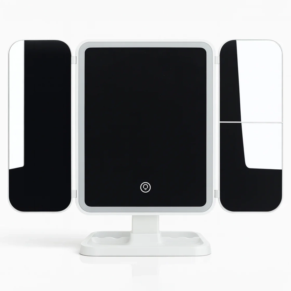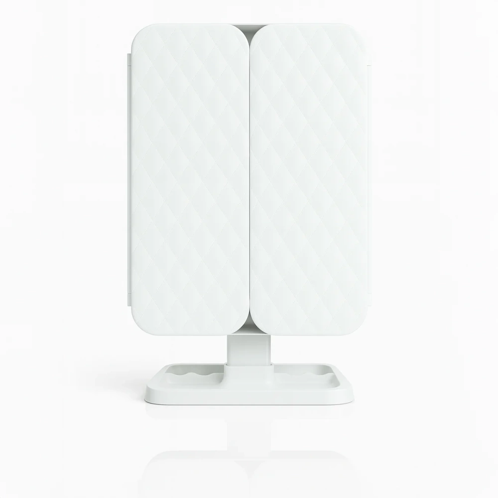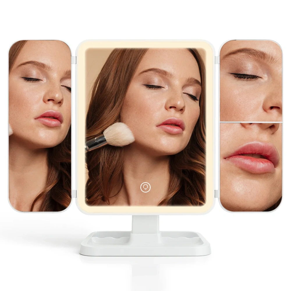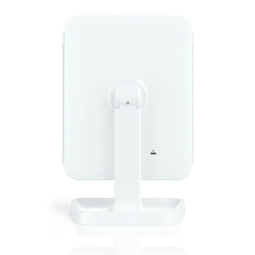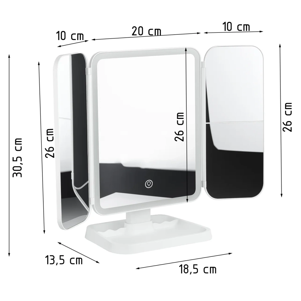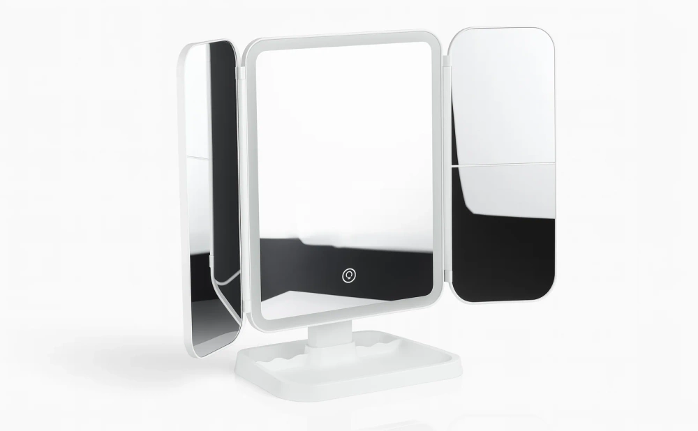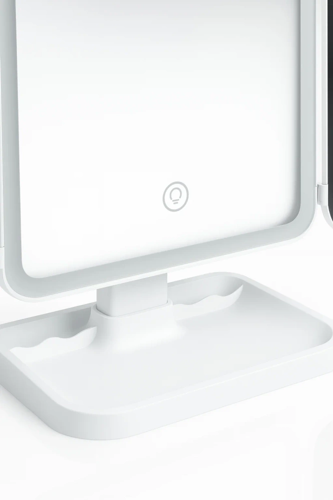 Огледалото предлага три цвята светлина и плавно регулиране на яркостта, така че да нагласите осветлението според естествените условия на околната среда. Практичната поставка за малки козметични продукти и аксесоари улеснява организацията, а сгъваемата конструкция спестява място.