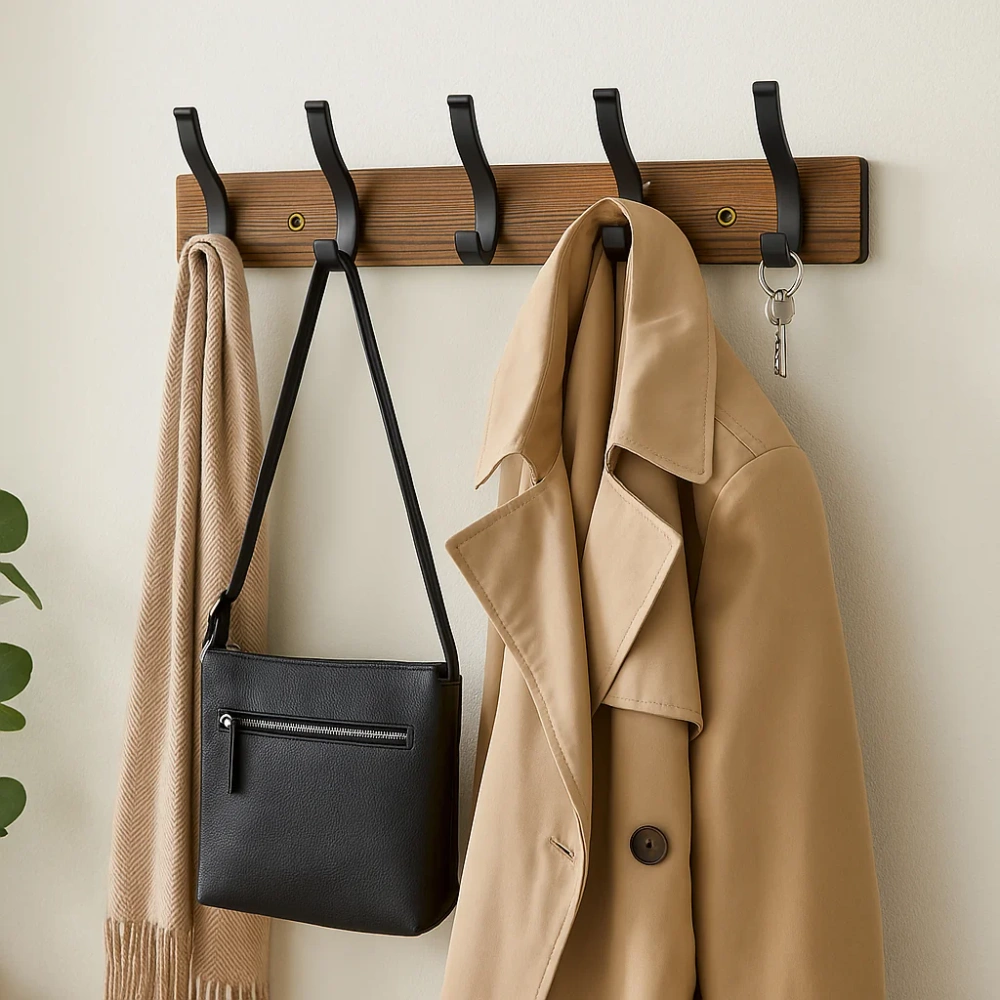 - Elegance og funktionalitet. Fremstillet af træ og aluminium. Solid og holdbar. 10 stærke kroge. To monteringsmetoder: dyvler eller lim. Perfekt til entre, badeværelse, køkken.