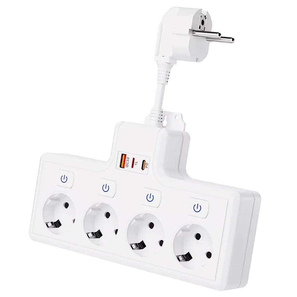 Strømfordeler med 4 Schuko-udtag 45° med USB-A, USB-C PD 20 W og Lightning | BGS-A+C+L-W