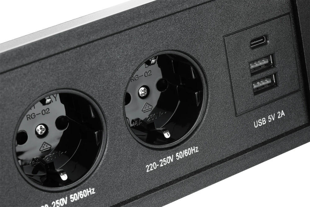 Moderne indbygget bordstik med skydecover er en praktisk og elegant løsning, der hjælper med at holde orden på arbejdspladsen, i køkkenet eller i mødelokalet.