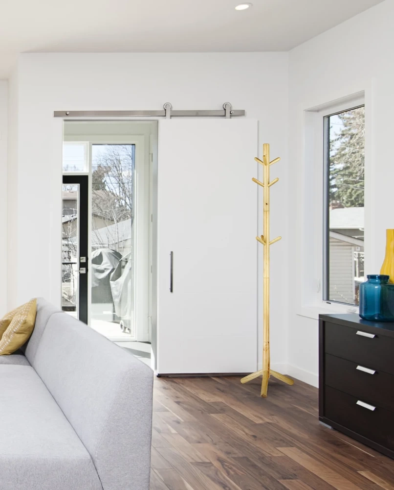 • - Houten staande hanger met 9 haken - Solide en stabiele modulaire constructie - Elegante glanzende afwerking - Hoogte 187 cm voor grote capaciteit - Dikke, stabiele basis zorgt voor veiligheid - Perfect voor een hal of slaapkamer