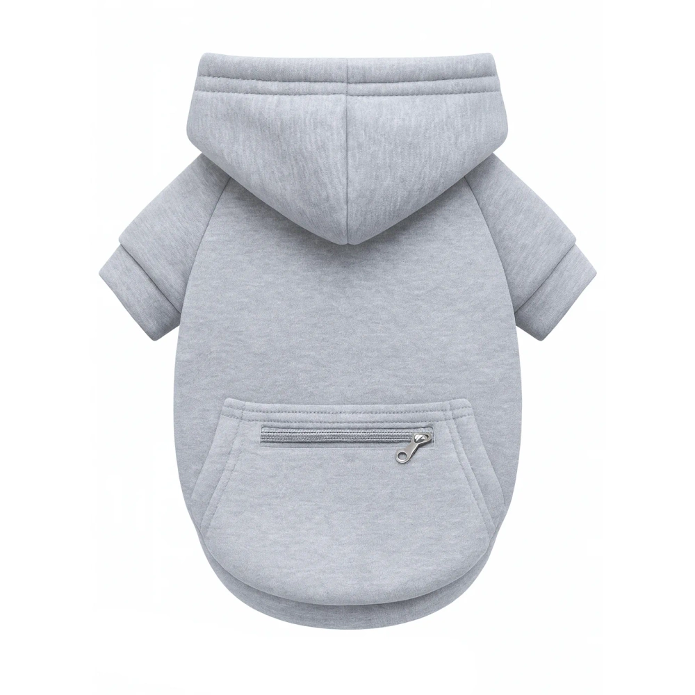 The hoodie is designed for comfort, featuring a hood with drawstrings and a zippered pocket—great for stashing treats or waste bags on a walk.