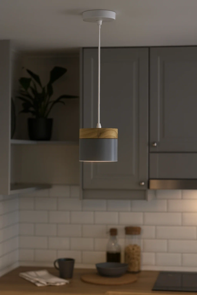 Cette suspension au design minimaliste associe un gris mat et chaleureux à du bois naturel, créant une ambiance douce et accueillante dans chaque pièce.