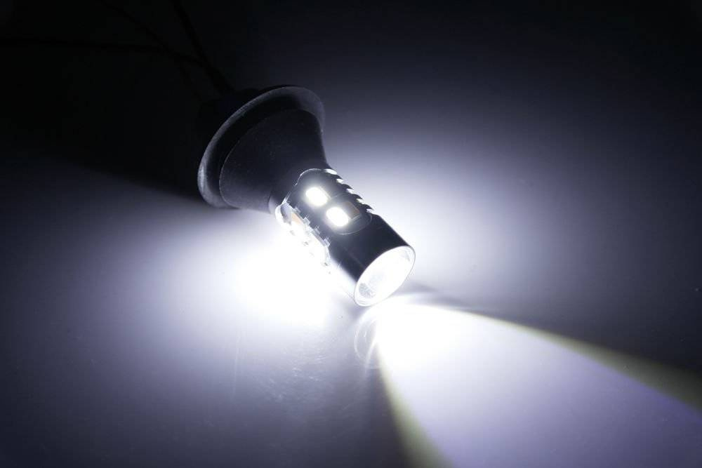 Die Lichtstärke der LED 2-in-1 Glühbirne 2 x 20 SMD 5730, die sich durch niedrigen Stromverbrauch und zwei Funktionen auszeichnet, ist vergleichbar mit der einer herkömmlichen Py21W Glühbirne. Dank der zahlreichen großflächigen LEDs und der kaltweißen Lichtfarbe wirkt das Licht jedoch optisch heller. Der Kauf und Einbau des 2-in-1 LED Sets 2x 20 SMD 5730 führt zu:
