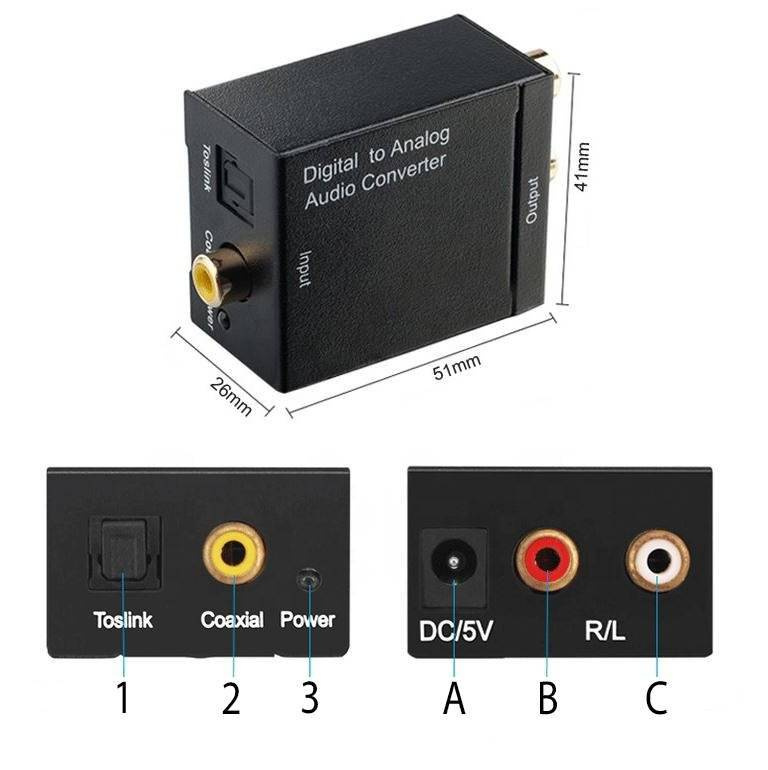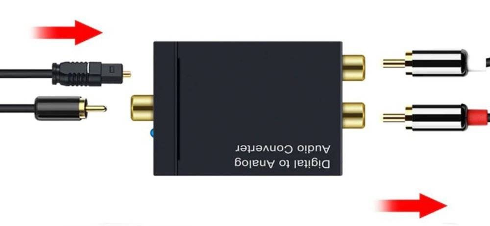 Der Konverter ermöglicht das Abspielen von Ton von modernen Fernsehern mit digitalen optischen Toslink SPDIF- oder Koaxialanschlüssen auf älteren Audiogeräten mit analogen RCA / Chinch-Eingängen.