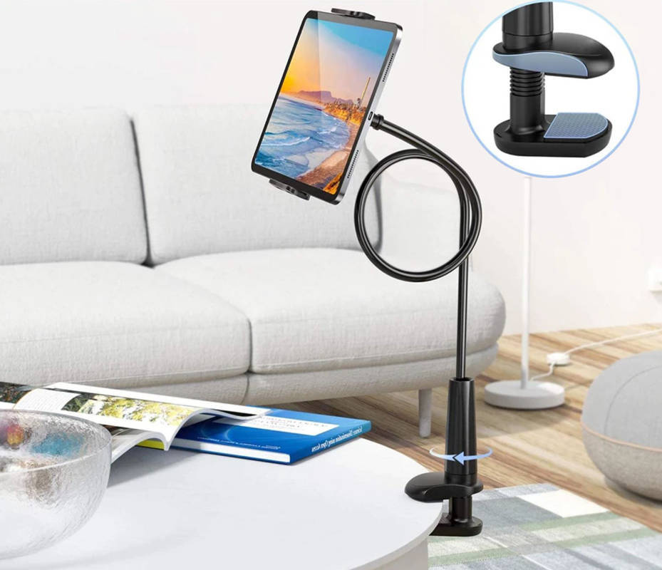 - Der Arm besteht aus einem metallischen Verbundmaterial, das auch schwere Smartphones und Tablets stabil hält.