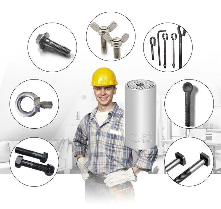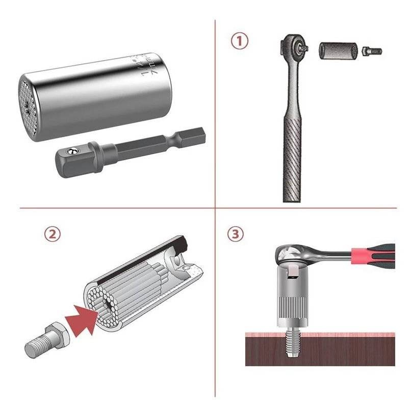 Der Mechanismus ermöglicht eine automatische Anpassung der Stecknuss an die Form und den Durchmesser von Schrauben oder anderen Elementen wie: