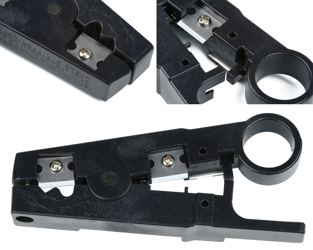 Abisolierer für UTP/STP-Kabel und andere mehradrige Leitungen mit Durchmessern von 3,2–9 mm sowie für flache Telefonkabel, Lautsprecher-, Alarm- und Koaxialkabel. Der Abisolierer verfügt über eine Durchmesser-Einstellung und austauschbare Klingen.