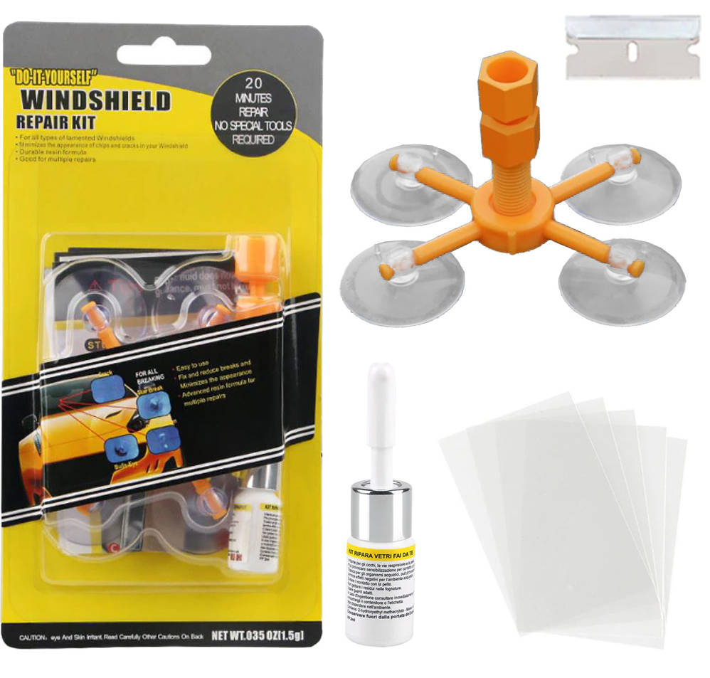 Windshield Repair Kit ist ein einfach zu verwendendes Set zur Reparatur von Autoscheiben und gläsernen Karosserieteilen, wie z. B. Scheinwerfern.