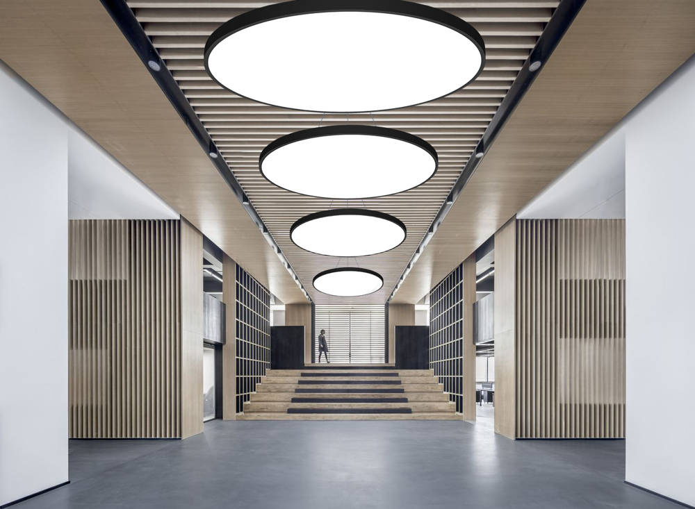 Die runde Bauform ermöglicht es, an der Decke einzigartige Lichtkompositionen zu schaffen, indem verschiedene Lampengrößen kombiniert werden – sowohl mit Öffnung in der Mitte als auch mit geschlossenem Schirm.
