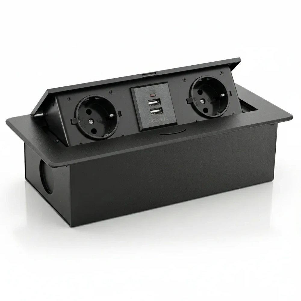 Set mit zwei Steckdosen mit Erdung und zwei USB-Anschlüssen im versenkbaren Gehäuse für die Arbeitsplatte