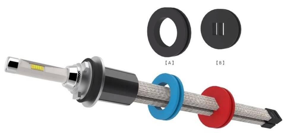 - Reduzierte Lampengröße. Ein häufiger Grund für Inkompatibilität mit Fahrzeugscheinwerfern ist, dass der Kühlkörper zu weit herausragt und die Lampenabdeckung nicht geschlossen werden kann. Unsere Lampe hebt sich durch die Verwendung flexibler Bänder hervor, die sich unter der Abdeckung im Scheinwerfer beliebig formen lassen.