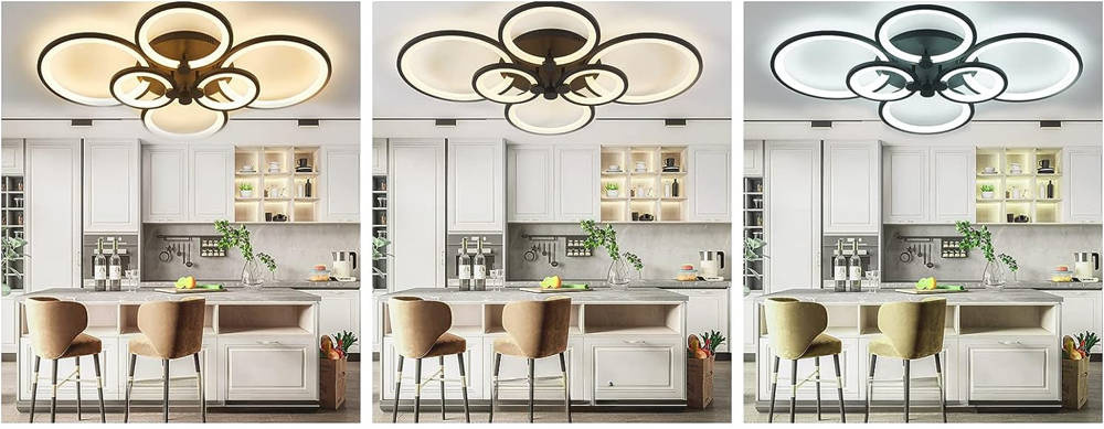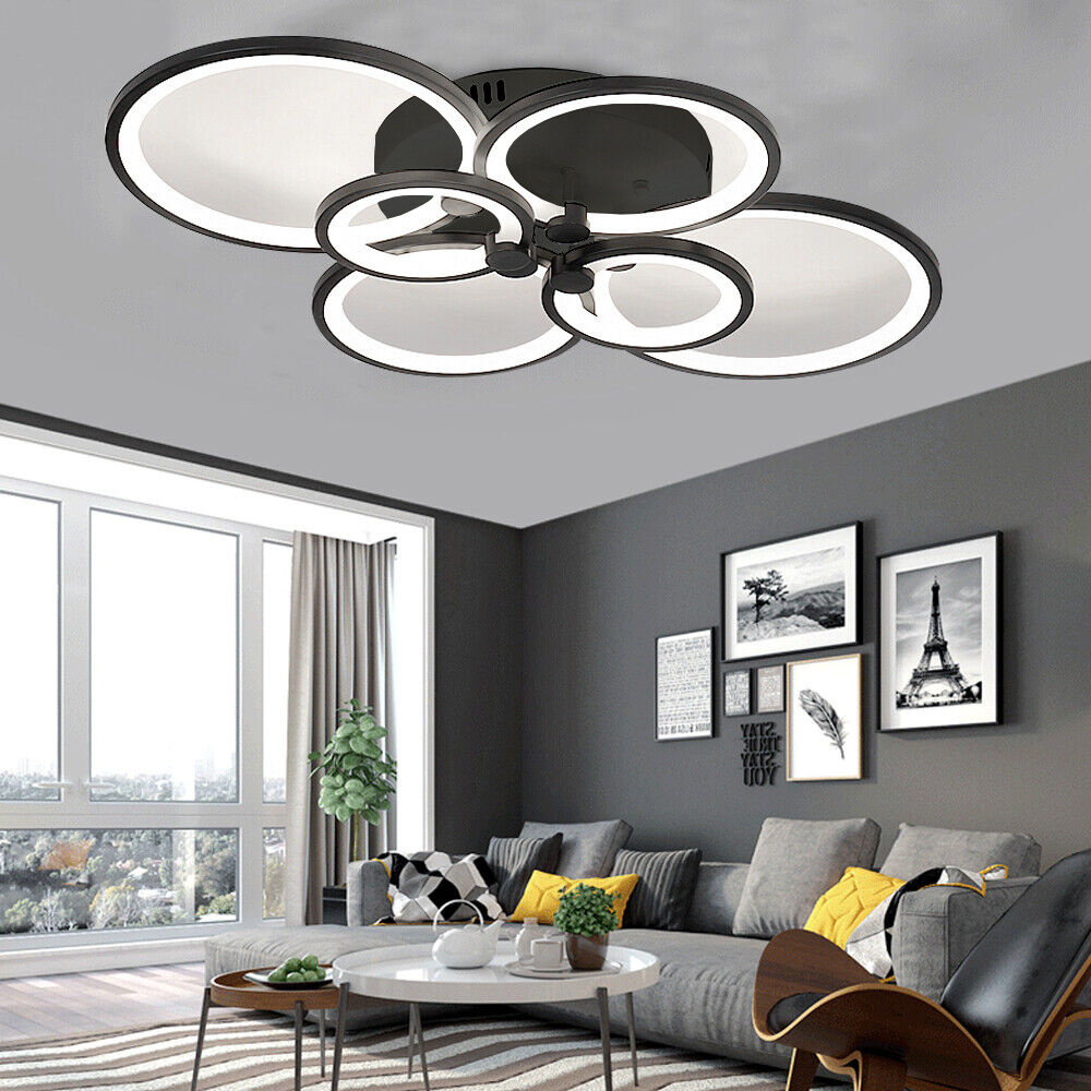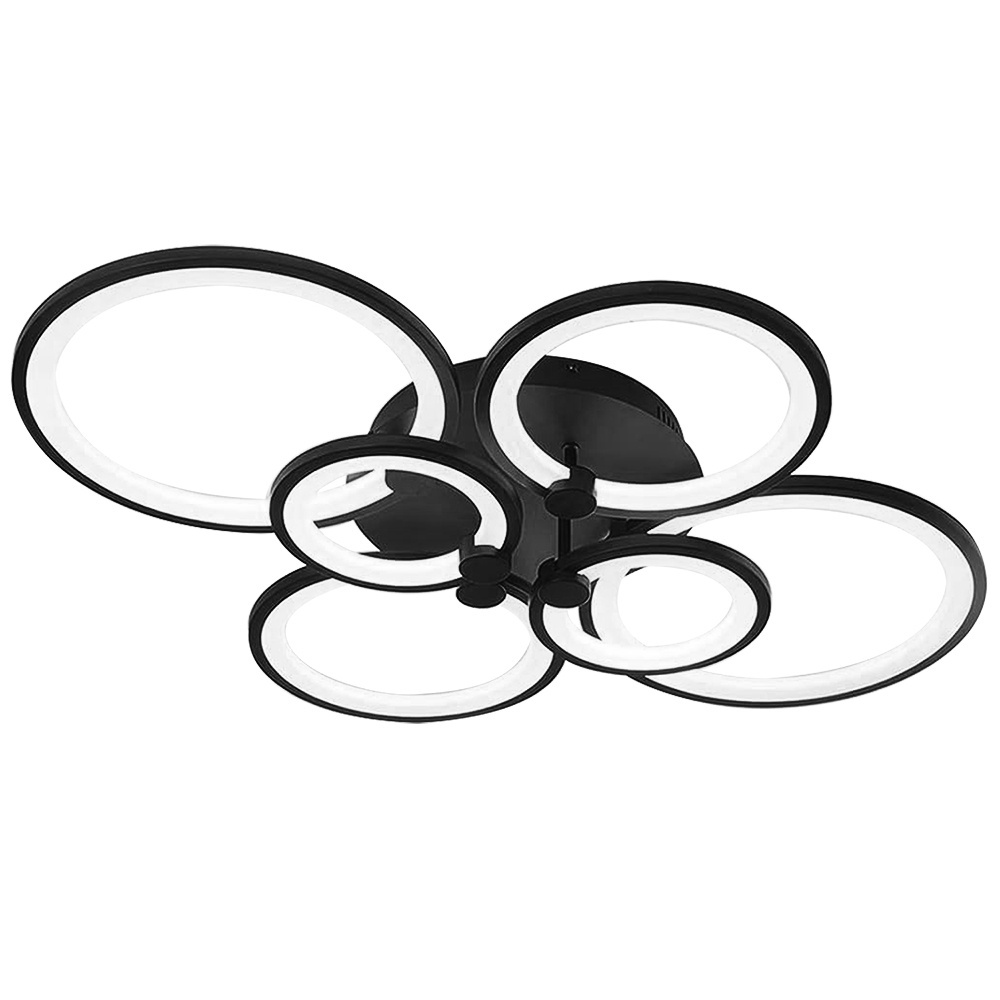 - - Moderne Deckenleuchte mit sechs Designerringen. - Drei Lichtfarben und eine Fernbedienung zum Einstellen der Helligkeit. - Perfekt für verschiedene Innenräume, einschließlich Büros und Konferenzräume. - Hohe LED-Leistung sorgt für gleichmäßige Beleuchtu