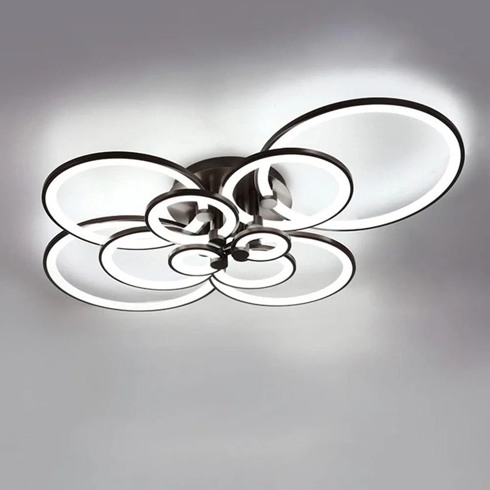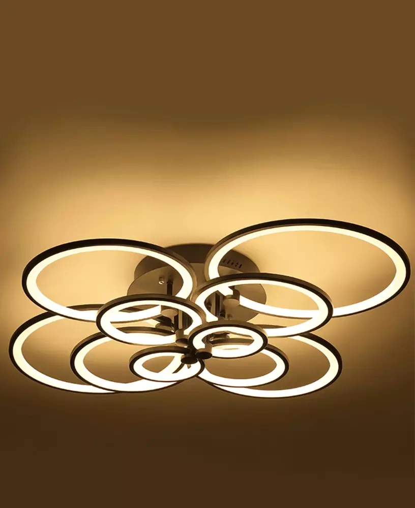 - - Moderne Deckenleuchte mit zehn Designerringen. - Drei Lichtfarben und eine Fernbedienung zum Einstellen der Helligkeit. - Perfekt für verschiedene Innenräume, einschließlich Büros und Konferenzräume. - Hohe LED-Leistung sorgt für gleichmäßige Beleuchtun