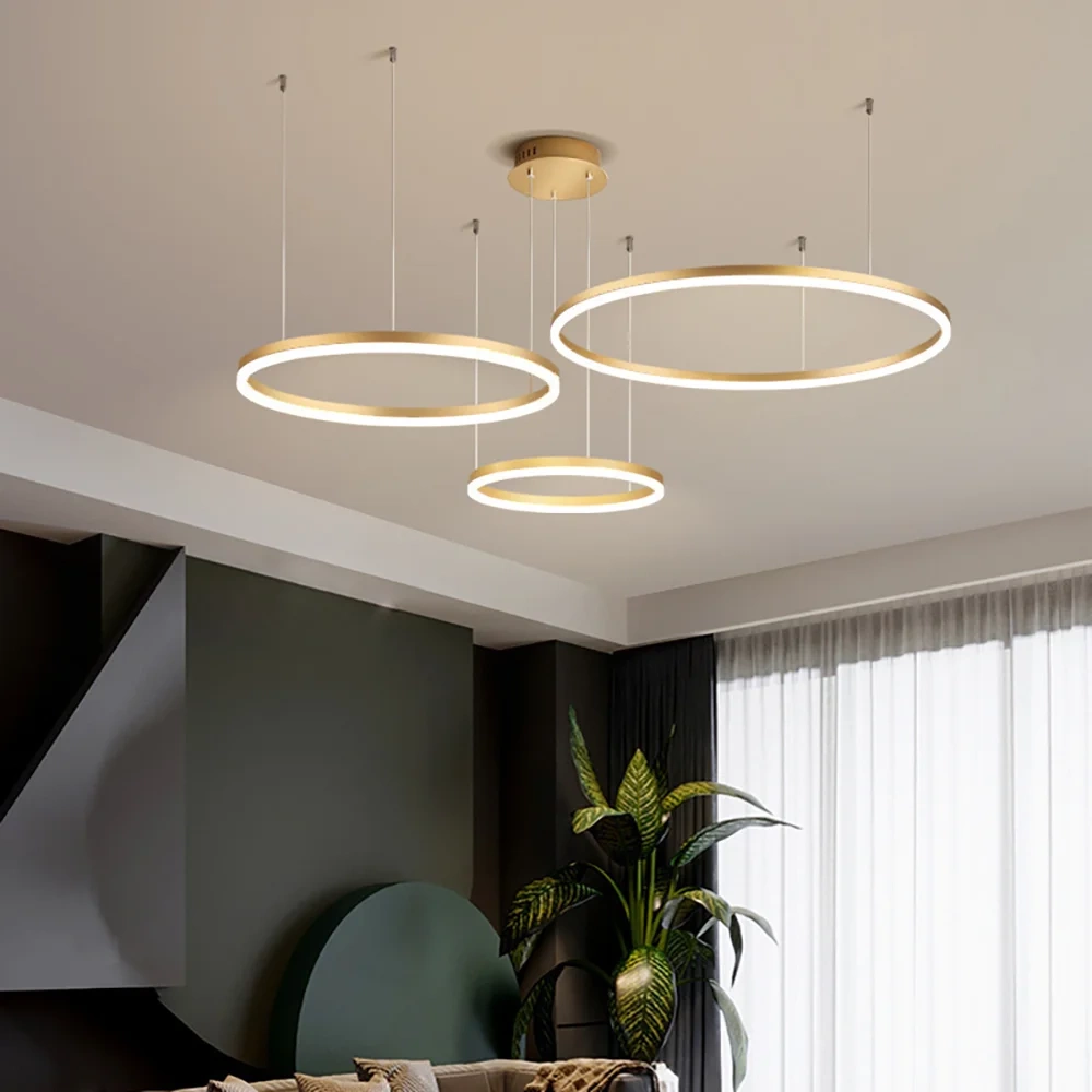 - - Hängende 136-W-LED-Deckenleuchte mit drei Ringen unterschiedlichen Durchmessers. - Modernes Design und drei Lichtfarben. - Perfekt für Wohnzimmer, Schlafzimmer, Büro und mehr. - Fernbedienung zum Einstellen von Helligkeit und Farbtemperatur.
