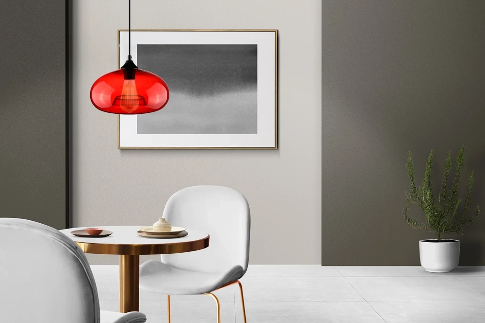Der schöne, rote Farbton des Lampenschirms erzeugt ein außergewöhnliches, warmes und angenehmes Licht. Die originelle Form der Lampe passt hervorragend zu modernen, Loft-, Glamour- und anderen Einrichtungsstilen.