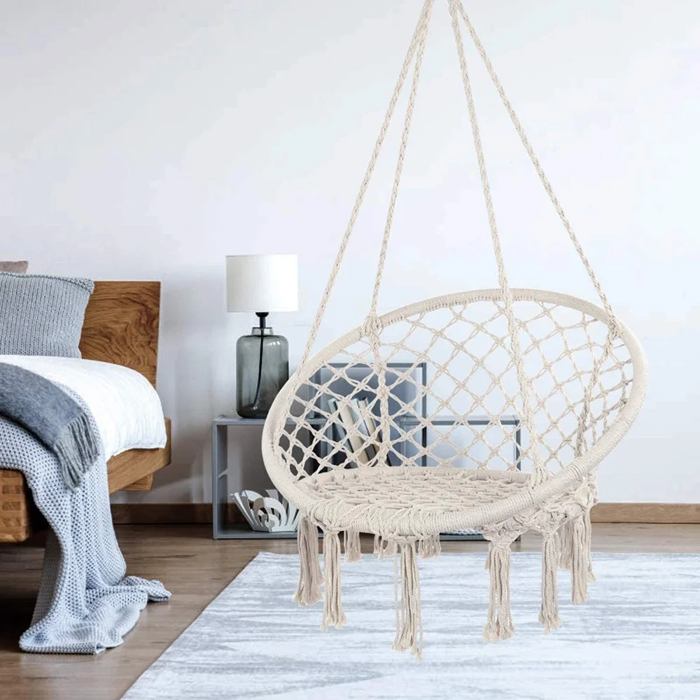 Die Schaukel ergänzt auch Innenräume durch ihre universellen Farben, die schönen geflochtenen Seile und die Fransen, die an den sehr angesagten Boho-Stil erinnern.