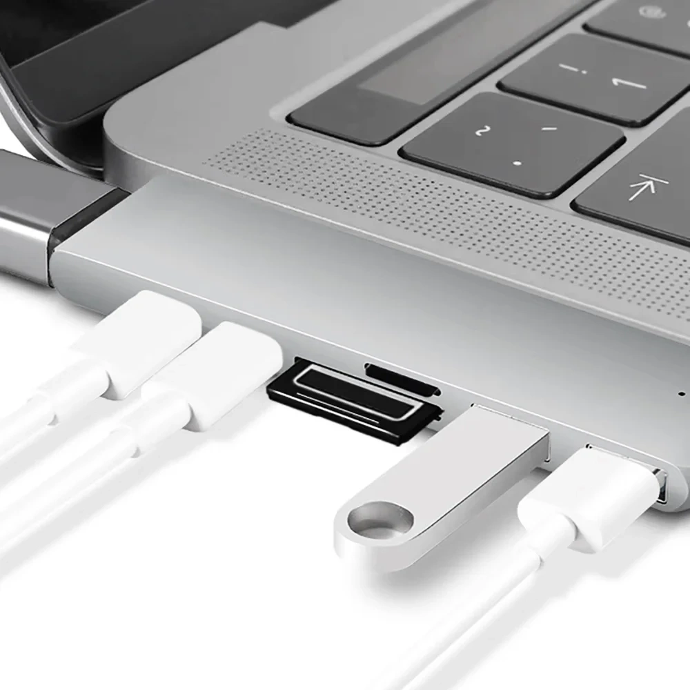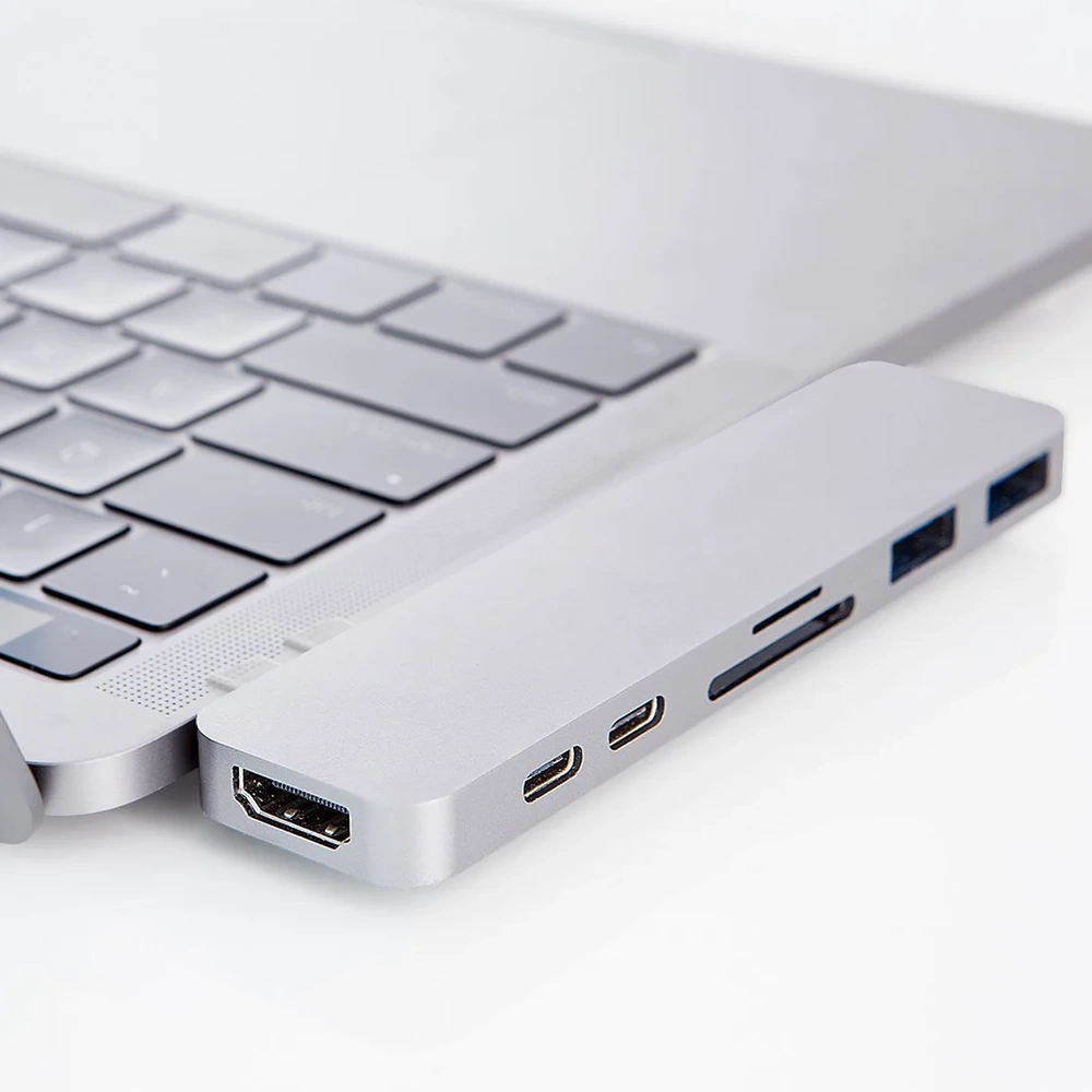 Multifunktionaler USB-C 7-in-1 Adapter, entwickelt für MacBook-Nutzer, die die Anschlussmöglichkeiten ihres Geräts erweitern möchten.