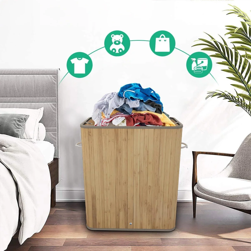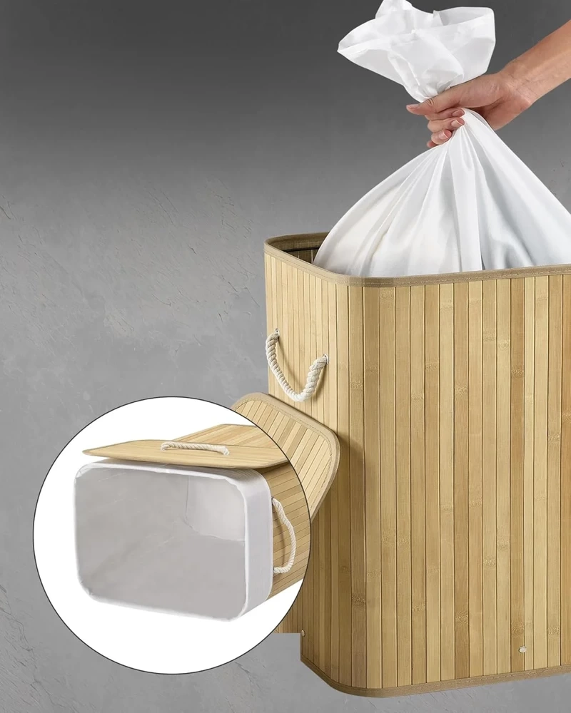 - Geräumig (100 l) und zwei Kammern für einfache Trennung. Langlebiges und ökologisches Bambusmaterial. Modernes Design, das zu verschiedenen Innenräumen passt. Solide Griffe und ein praktischer Deckel. Leicht zu reinigen und zu pflegen.