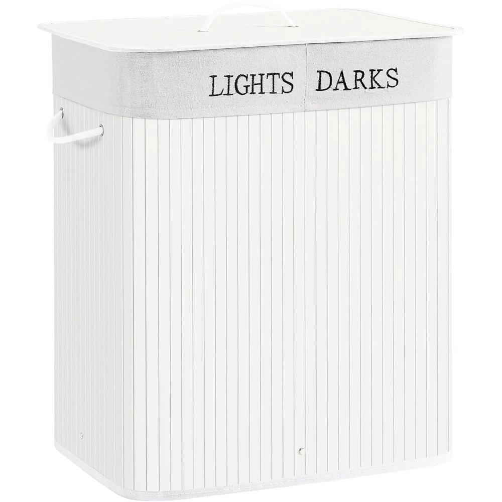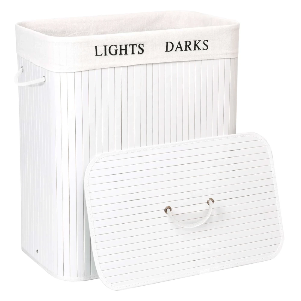 - Geräumig (100 l) und zwei Kammern für einfache Trennung. Langlebiges und ökologisches Bambusmaterial. Modernes Design, das zu verschiedenen Innenräumen passt. Solide Griffe und ein praktischer Deckel. Leicht zu reinigen und zu pflegen.