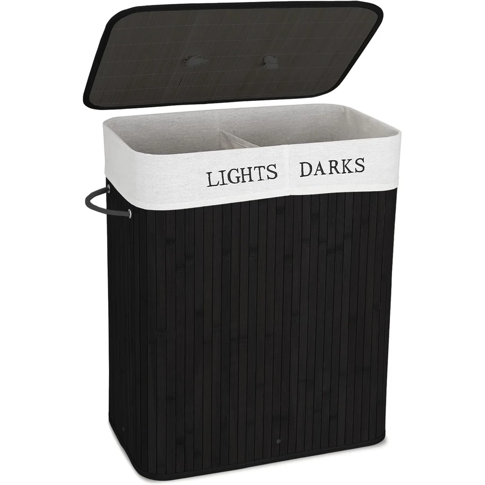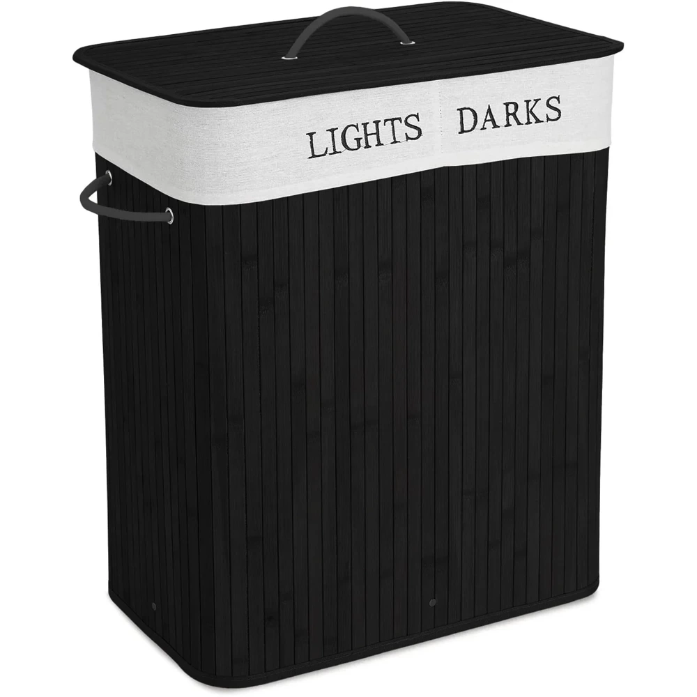 Wäschekorb | 100 l | zweigeteilt, aus Bambus und Holz, auch als Spielzeugbox geeignet | schwarz | ZYL-100L-BLACK