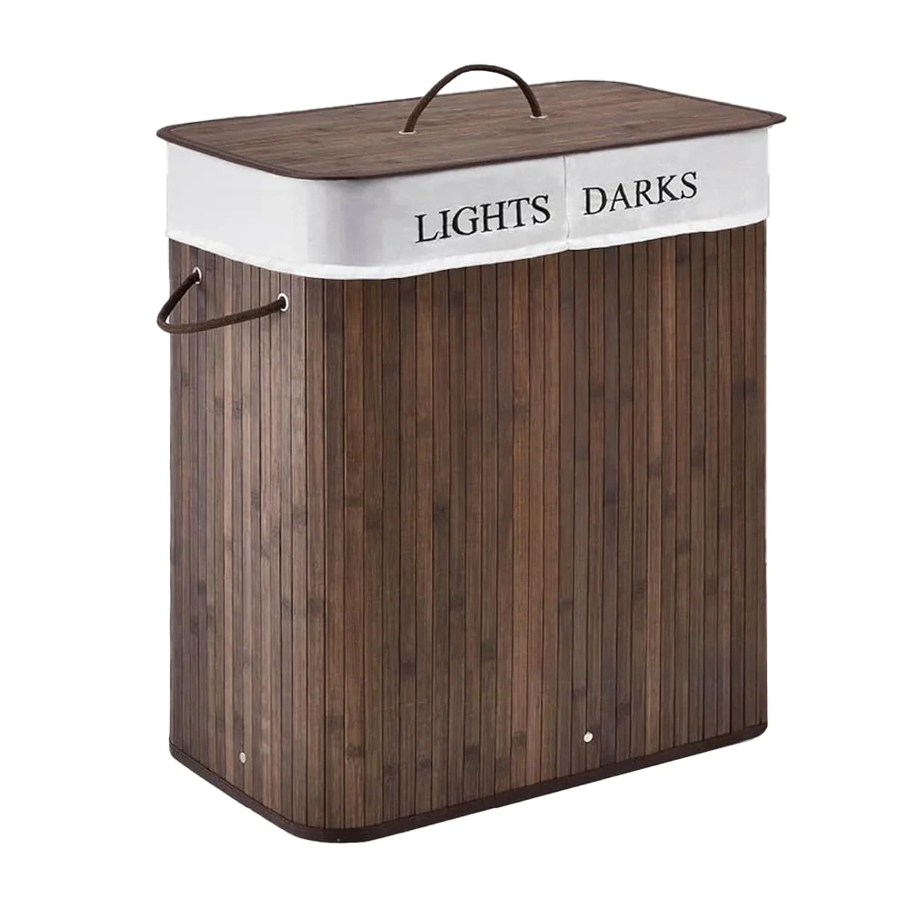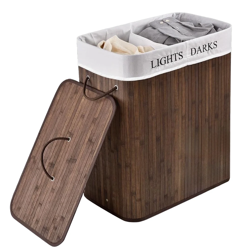 Wäschekorb | 100 l | zweigeteilt, aus Bambus und Holz, geeignet als Spielzeugbox oder Wäschesammler für Bad | braun | ZYL-100L-DABR
