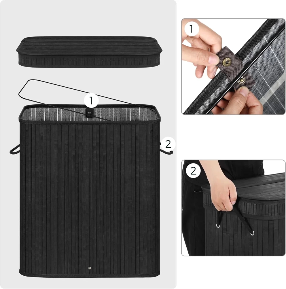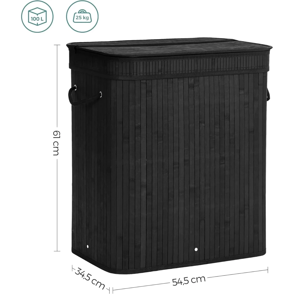 Wäschekorb | 100 l, zweigeteilt, aus Bambus und Holz, geeignet als Spielzeugbox oder Wäschebehälter für Badezimmer | schwarz | RYL-100L-BLACK