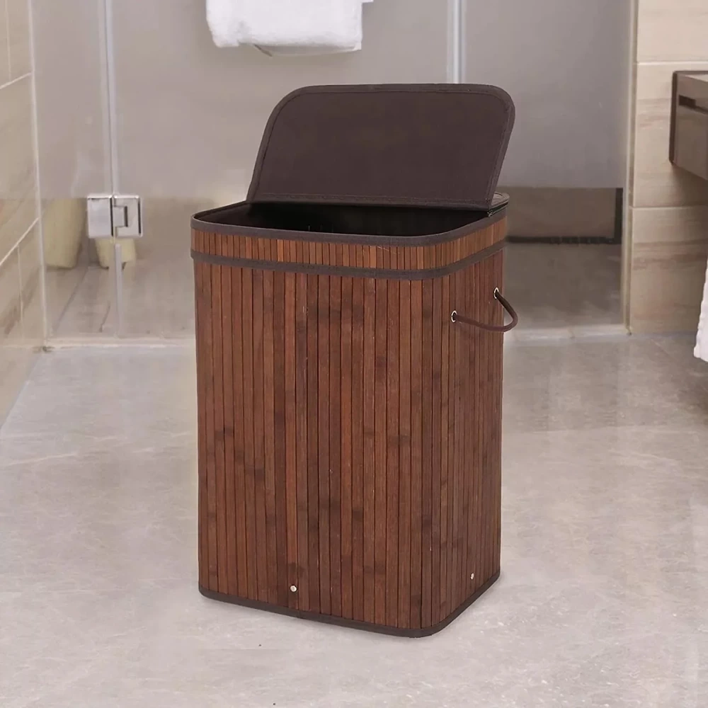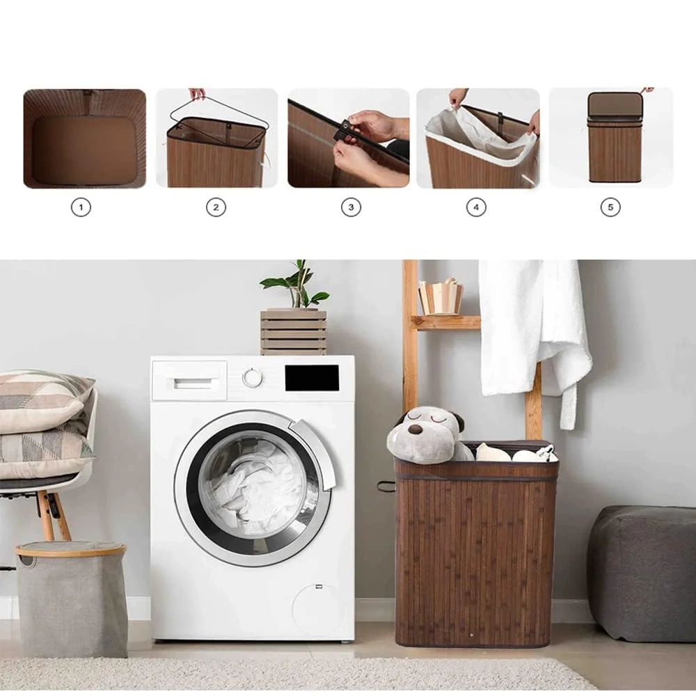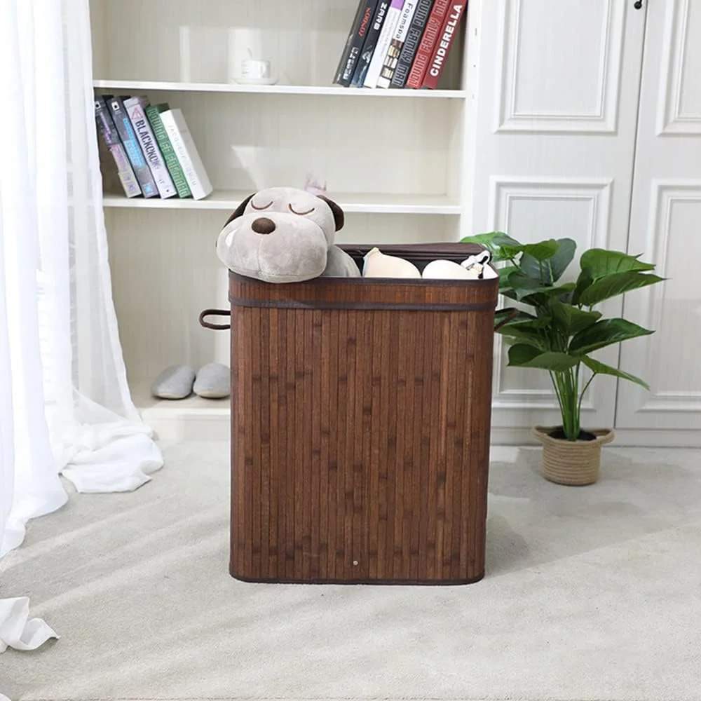 - Geräumig (100 l) mit zwei Fächern zur Trennung. Hergestellt aus ökologischem Bambus. Universelles und zeitloses Design. Solide Griffe und ein praktischer Deckel. Leicht zu reinigen und zu pflegen.