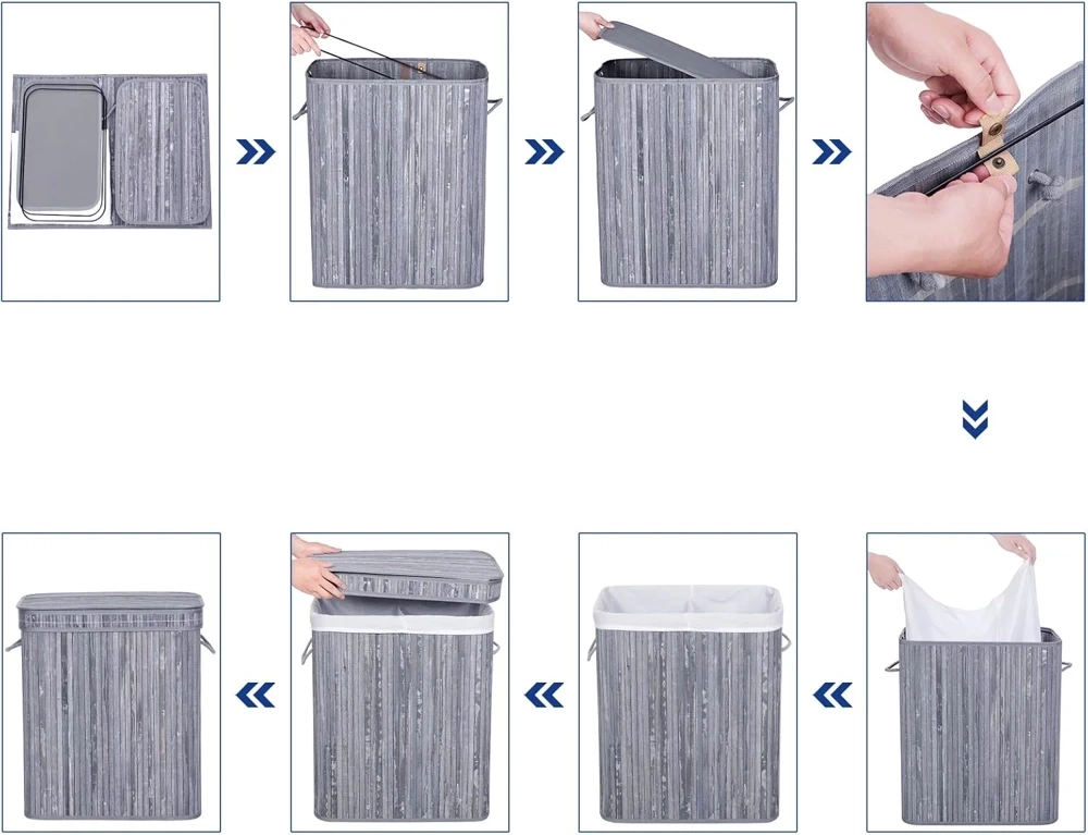 - Geräumig (100 l) mit zwei Fächern zur Trennung. Hergestellt aus ökologischem Bambus. Universelles und zeitloses Design. Solide Griffe und ein praktischer Deckel. Leicht zu reinigen und zu pflegen.