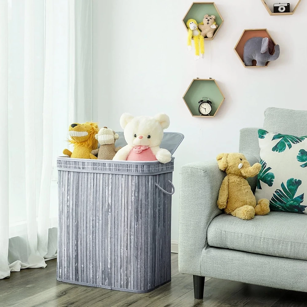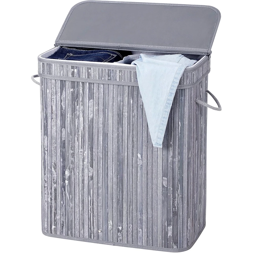 Wäschekorb | 100 l, zweifach unterteilt, aus Bambus und Holz, für Bad oder Spielzeugaufbewahrung | grau | RYL-100L-GREY