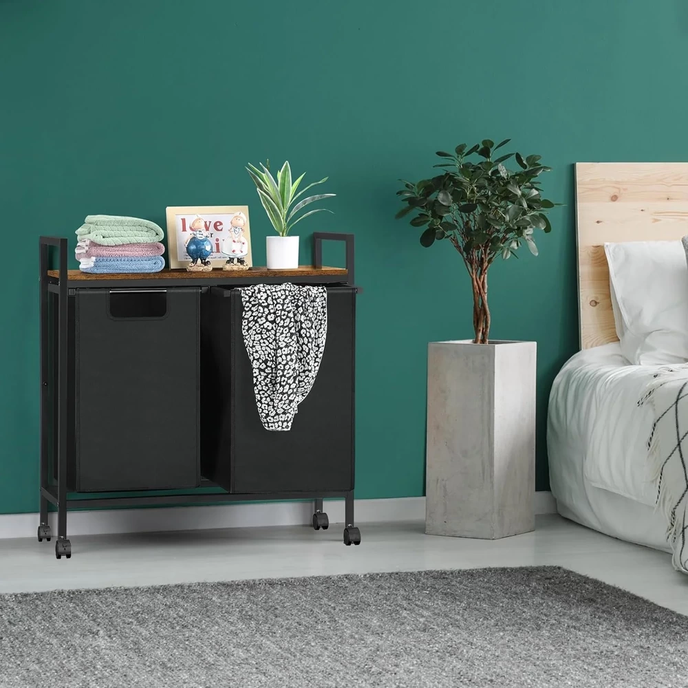 Wäschekorb mit Ablage | 2 Fächer | mit Rollen | schwarz | MZ-B20-BLACK