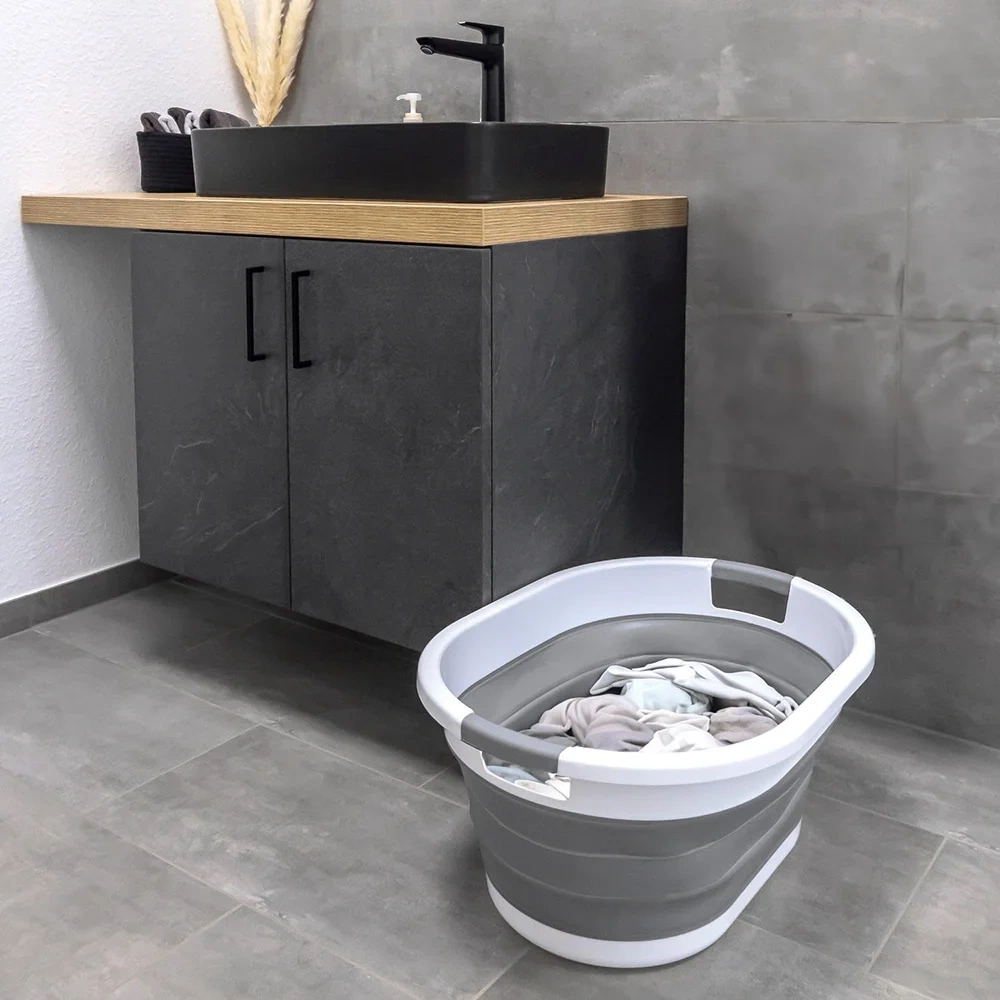 Der Wäschekorb/Schüssel mit einem Fassungsvermögen von 26 Litern lässt sich einfach flach zusammenklappen und ist damit ideal für kleine Räume. Das faltbare Design ermöglicht eine Aufbewahrung selbst in engen Ecken, wie im Schrank, unter dem Bett oder hinter der Tür.