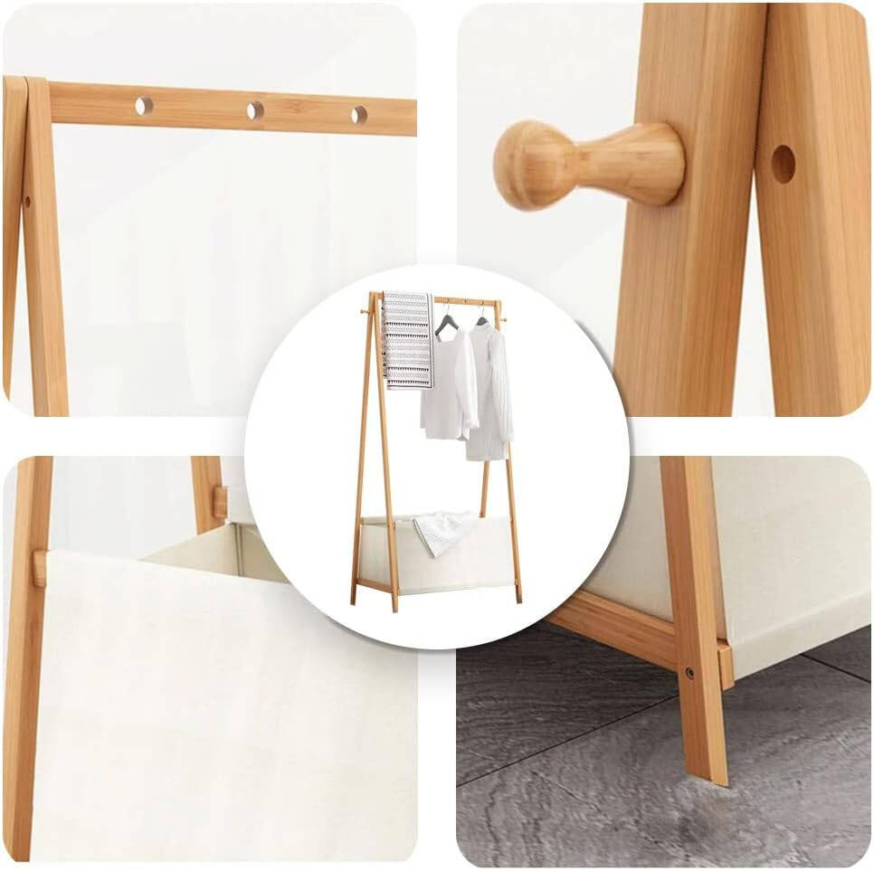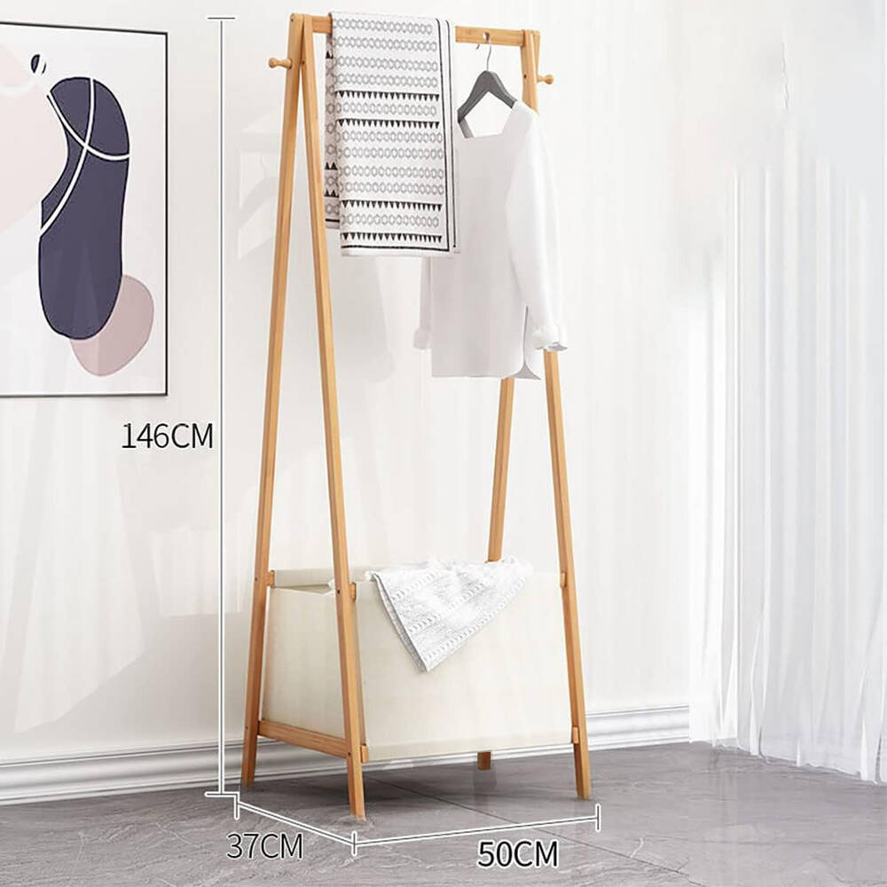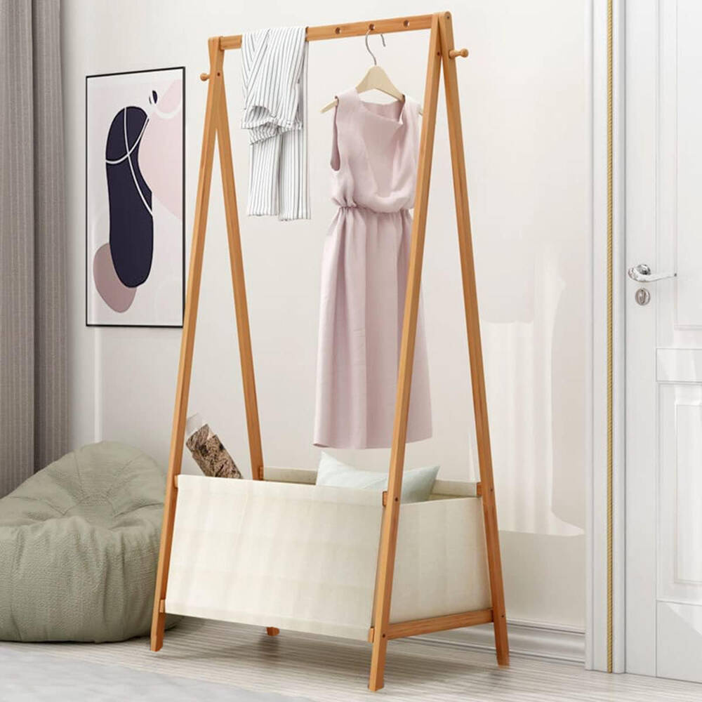 - – Bambus-Kleiderbügel mit Korb und Rädern – 2 Haken für Kleidung und Accessoires – Leinenkorb für größere Accessoires – drehbare Räder für einfachen Transport – funktionale Ergänzung für den Flur oder das Schlafzimmer