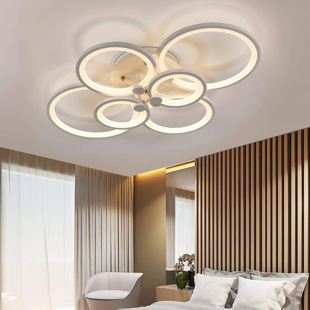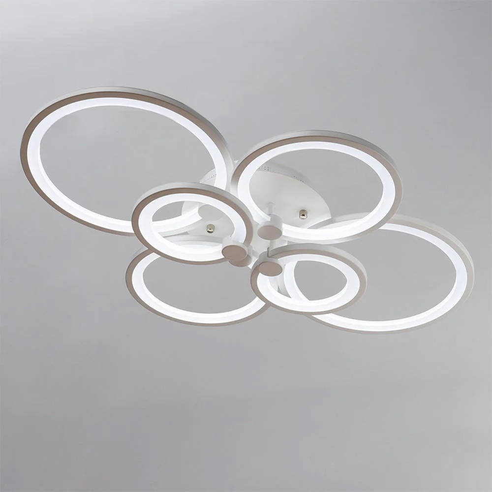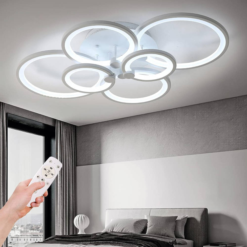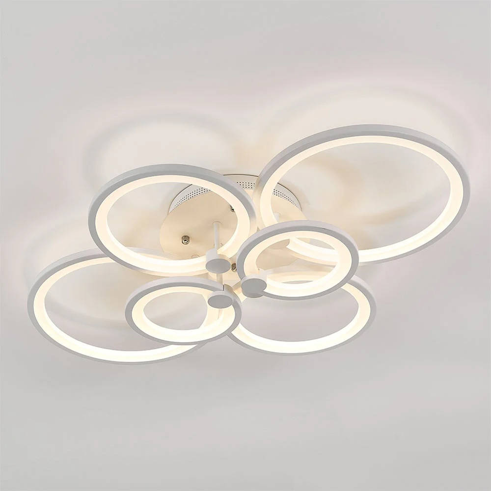 - - Moderne Deckenleuchte mit sechs Designerringen. - Drei Lichtfarben und eine Fernbedienung zum Einstellen der Helligkeit. - Perfekt für verschiedene Innenräume, einschließlich Büros und Konferenzräume. - Hohe LED-Leistung sorgt für gleichmäßige Beleuchtu