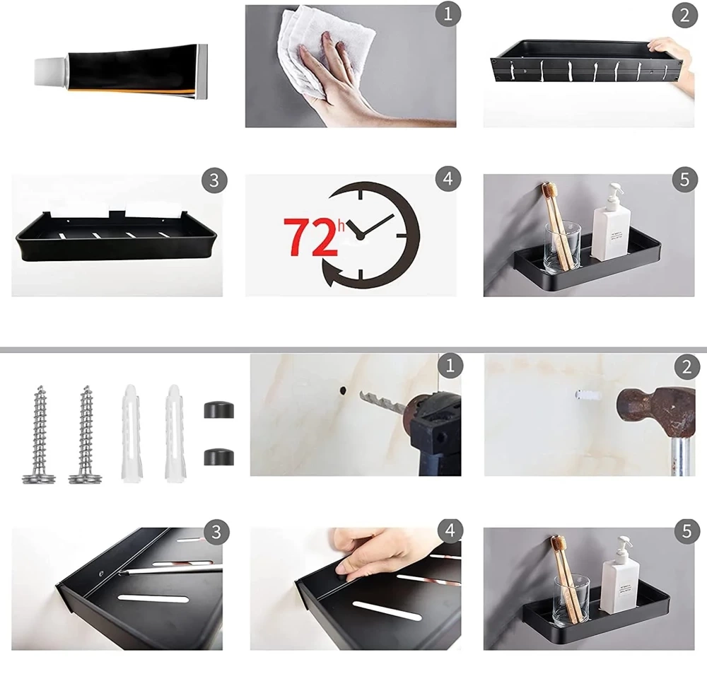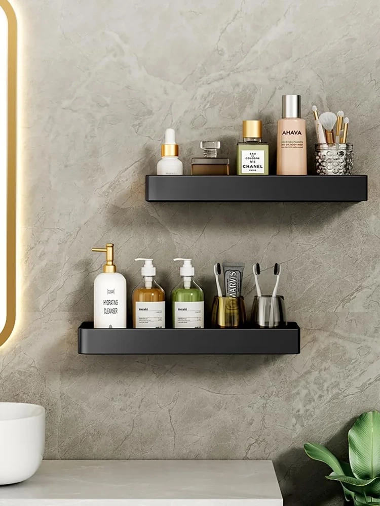 - - Ästhetisches Design: schwarzes Metall - Langlebig und feuchtigkeitsbeständig - Platzsparend in kleinen Badezimmern - Einfache Wartung und Reinigung - Installation mit Kleber oder Schrauben - Praktische Aufbewahrung von Kosmetika - Abmessungen: 60x12,5x3