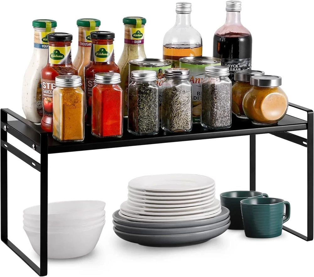 Das Regal ermöglicht eine effiziente Nutzung des Raums und schafft zusätzlichen Platz zur Aufbewahrung verschiedener Küchenutensilien wie Gewürze, Geschirr, Teller und Tassen.