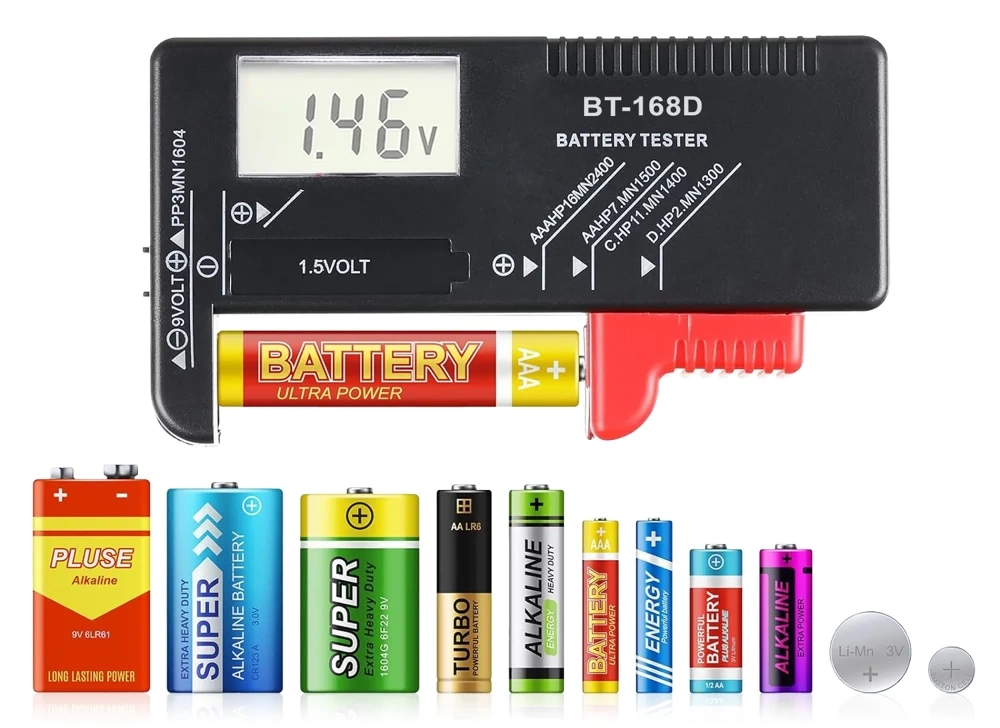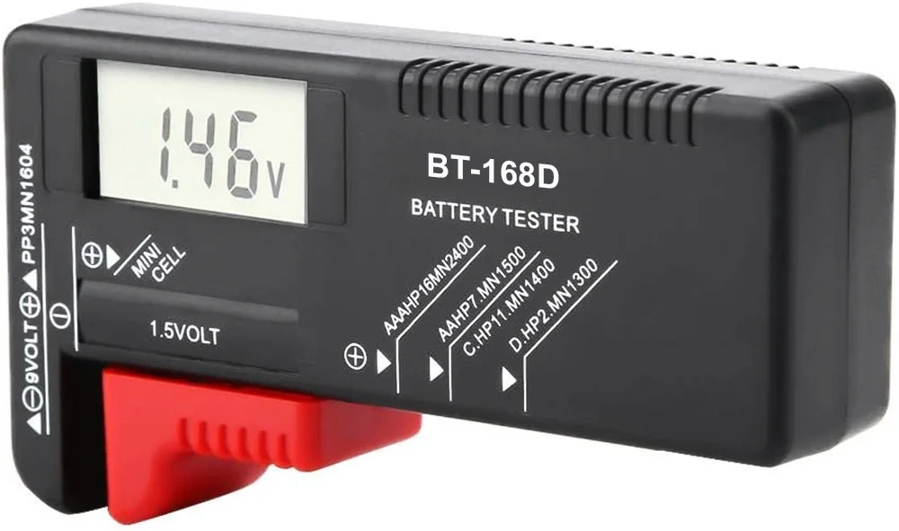 - Prüft AA-, AAA-, C-, D-, 1,5-V-, 9-V- und Knopfbatterien. Einfach und sicher: Übersichtliche Skala, kompakt, sicher – keine Verschwendung funktionsfähiger Batterien. Kompakt und mobil: Kleiner als ein Telefon, immer griffbereit.
