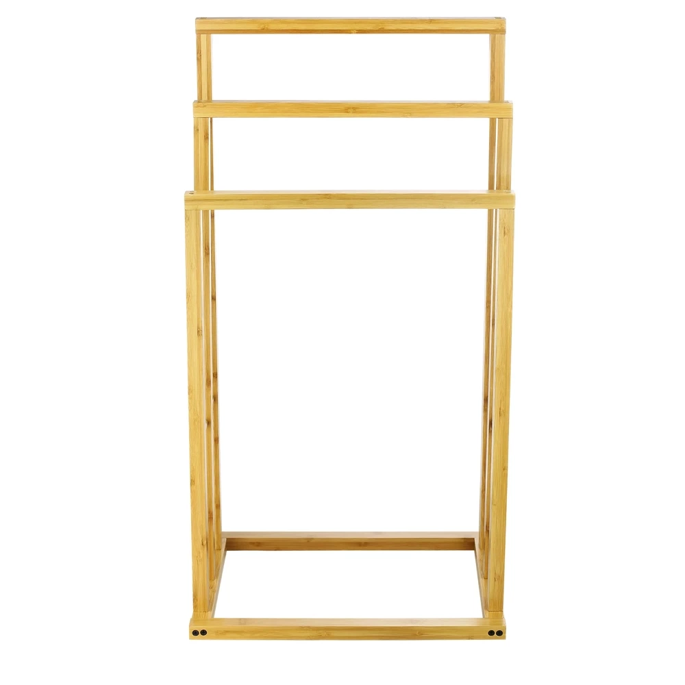 Stilvoller Handtuchständer aus Bambus mit drei Stangen in unterschiedlicher Höhe – eine praktische Lösung für Badezimmer, Küche, Waschküche oder Schlafzimmer. Durch das natürliche Aussehen und die kompakten Maße passt er in jede Einrichtung und bietet gleichzeitig optimalen Platz zum Trocknen von Handtüchern und anderen Textilien.