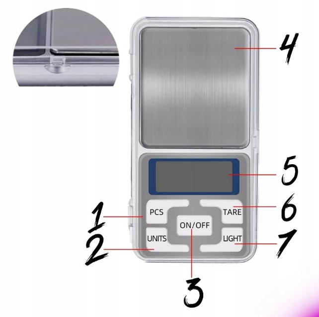 - Tarieren-Taste – ermöglicht das Nullstellen der Waage nach Bedarf. Unverzichtbar beim Wiegen mit Messbecher oder Behälter.