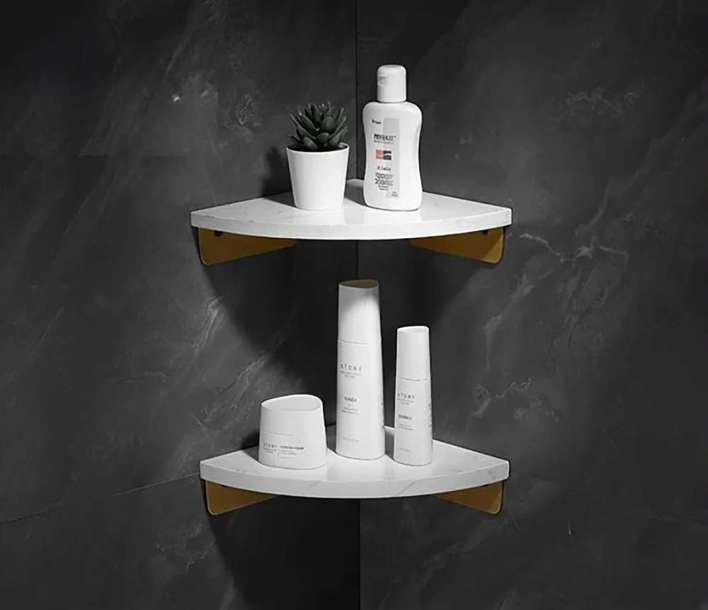 Das moderne Badezimmerregal ist ein hochwertiges Accessoire mit schlichtem Design, das jedem Badezimmer einen eleganten Akzent verleiht. Die goldene Metallkonstruktion in Kombination mit weißem Stein sorgt für einen stilvollen Charakter, unabhängig von Größe oder Einrichtung des Raumes.