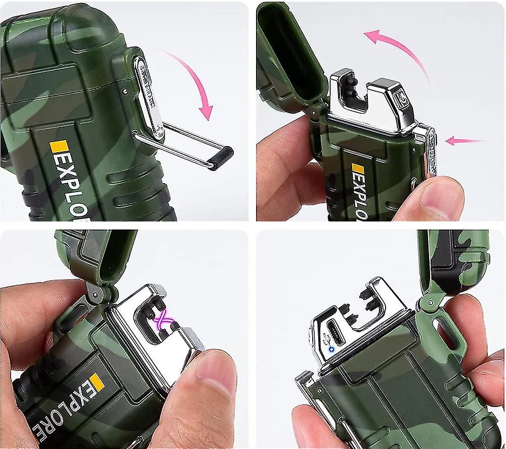 • IP65 wasserdicht. USB-Aufladung in 1–1,5 Stunden. Funktionelles Trageband um den Hals oder Gürtel. Tragbare und solide Konstruktion. Winddichter Doppelplasmabogen.