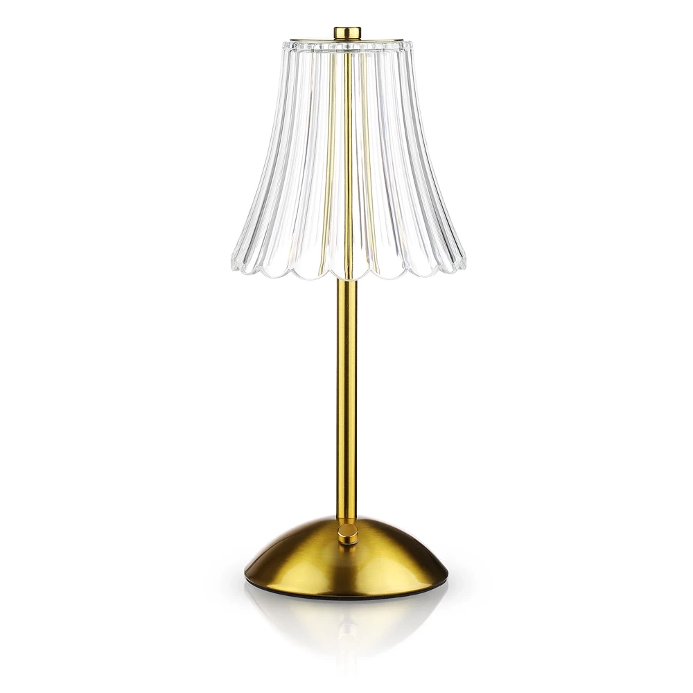 Das Metallgehäuse mit schöner goldener Oberfläche und der funkelnde Lampenschirm mit Kristalleffekt unterstreichen das elegante Erscheinungsbild. Der Touch-Schalter an der Basis ermöglicht das Ein- und Ausschalten sowie die Änderung der Lichtfarbe und Helligkeit.