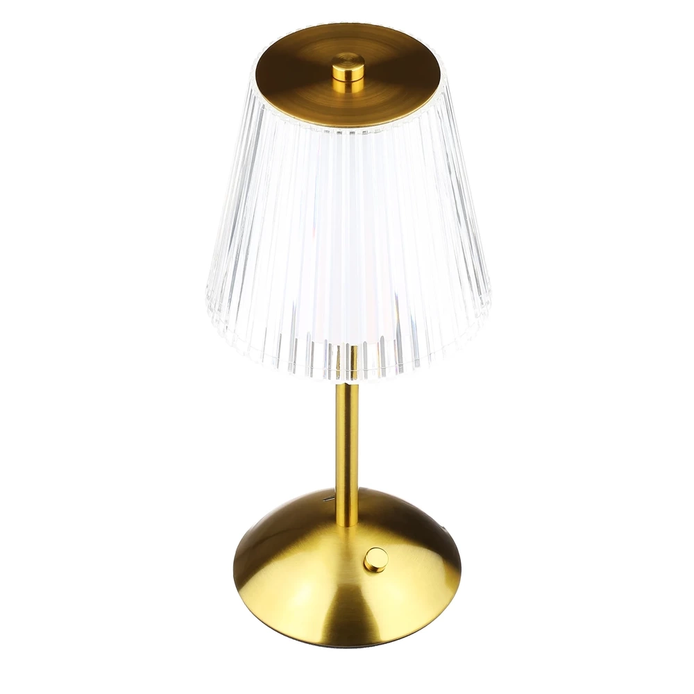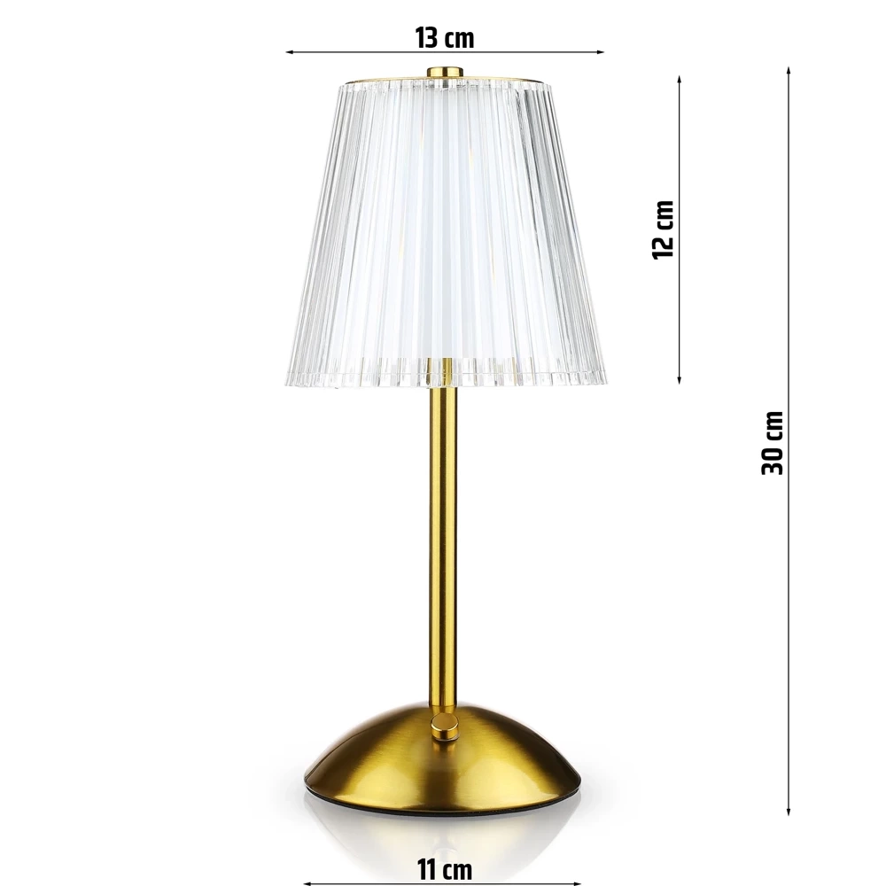Das Metallgehäuse mit schöner goldener Oberfläche und der schimmernde Schirm mit Kristall-Effekt unterstreichen das elegante Erscheinungsbild der Lampe. Der Touch-Schalter an der Basis dient zur Bedienung – damit kann die Lampe ein- und ausgeschaltet sowie die Lichtfarbe und -intensität geändert werden.
