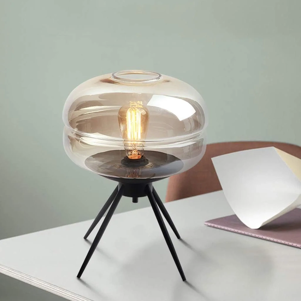 Ideal, um eine besondere und gemütliche Atmosphäre in Ihrem Zuhause zu schaffen. Die Kombination aus schön geformtem Glas und einem Metallfuß sowie das markante Design verleihen der Lampe einen einzigartigen Charakter.