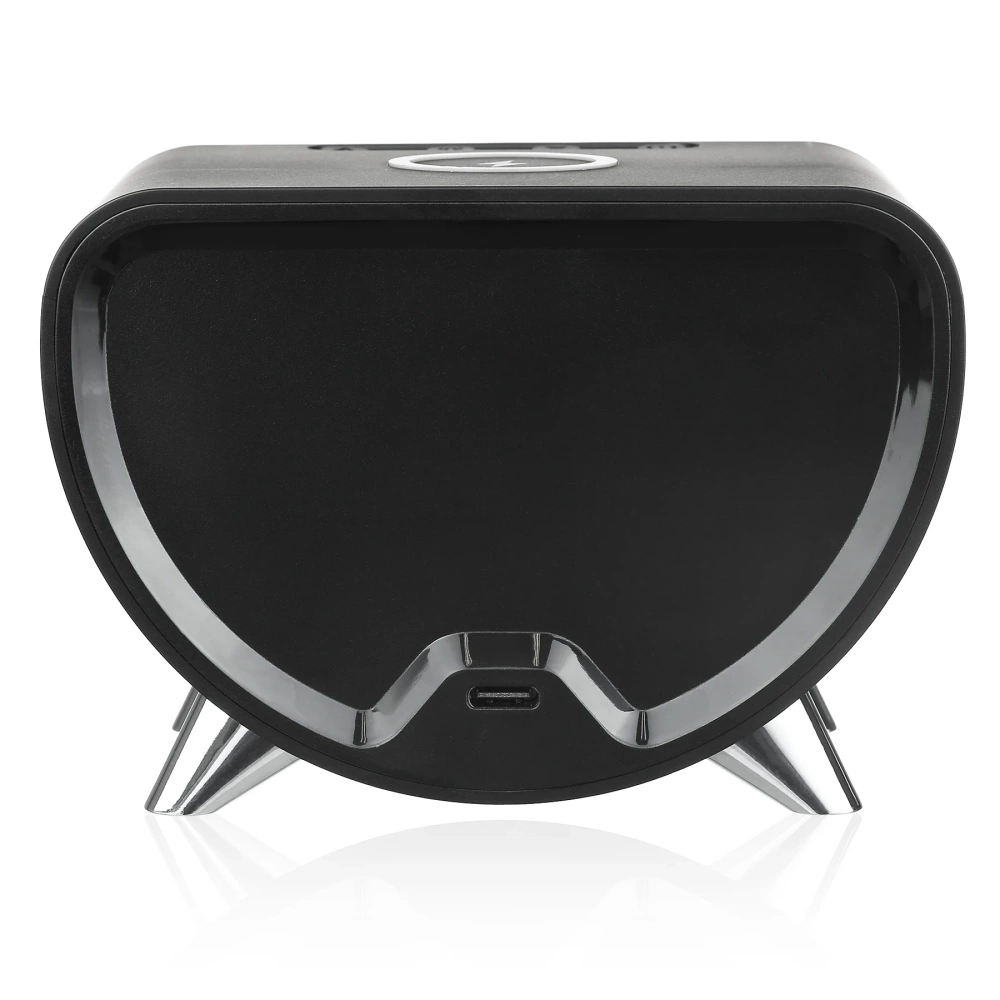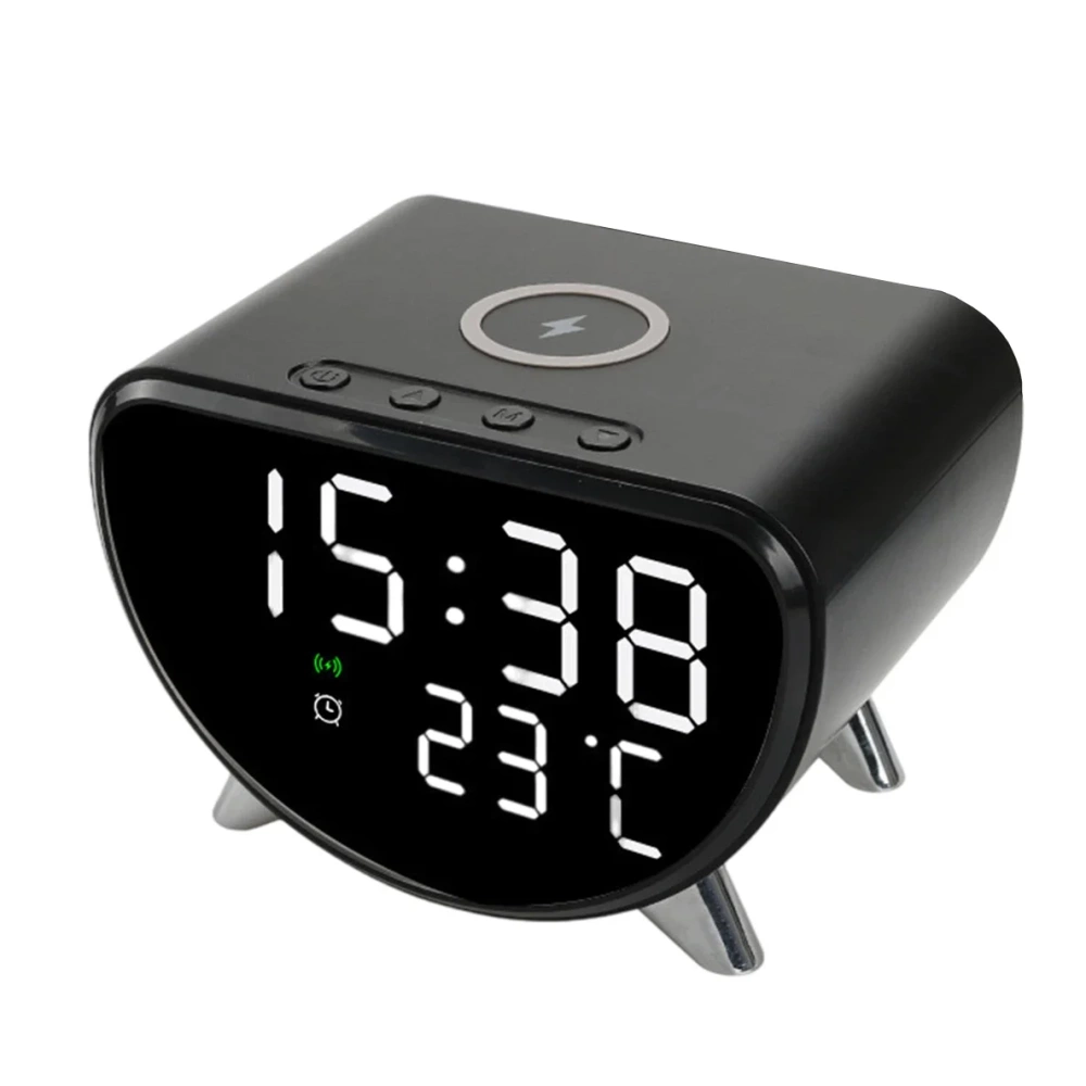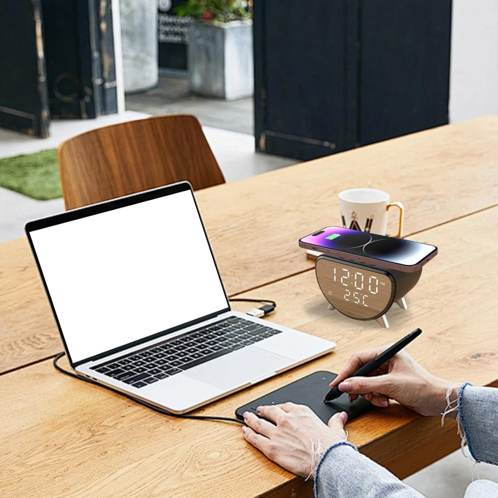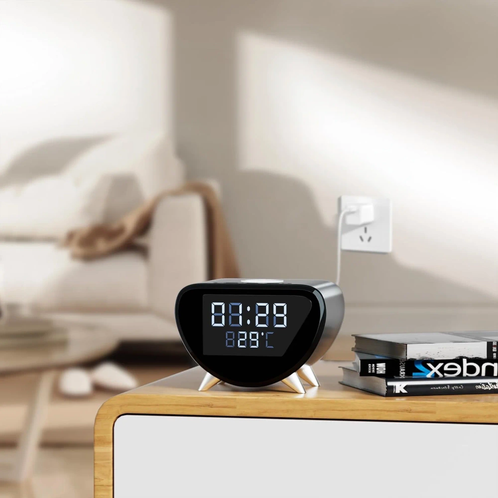Entdecken Sie die innovative Verbindung von Funktionalität und elegantem Design mit einem Wecker, der ein 15W Qi-Schnellladegerät integriert.