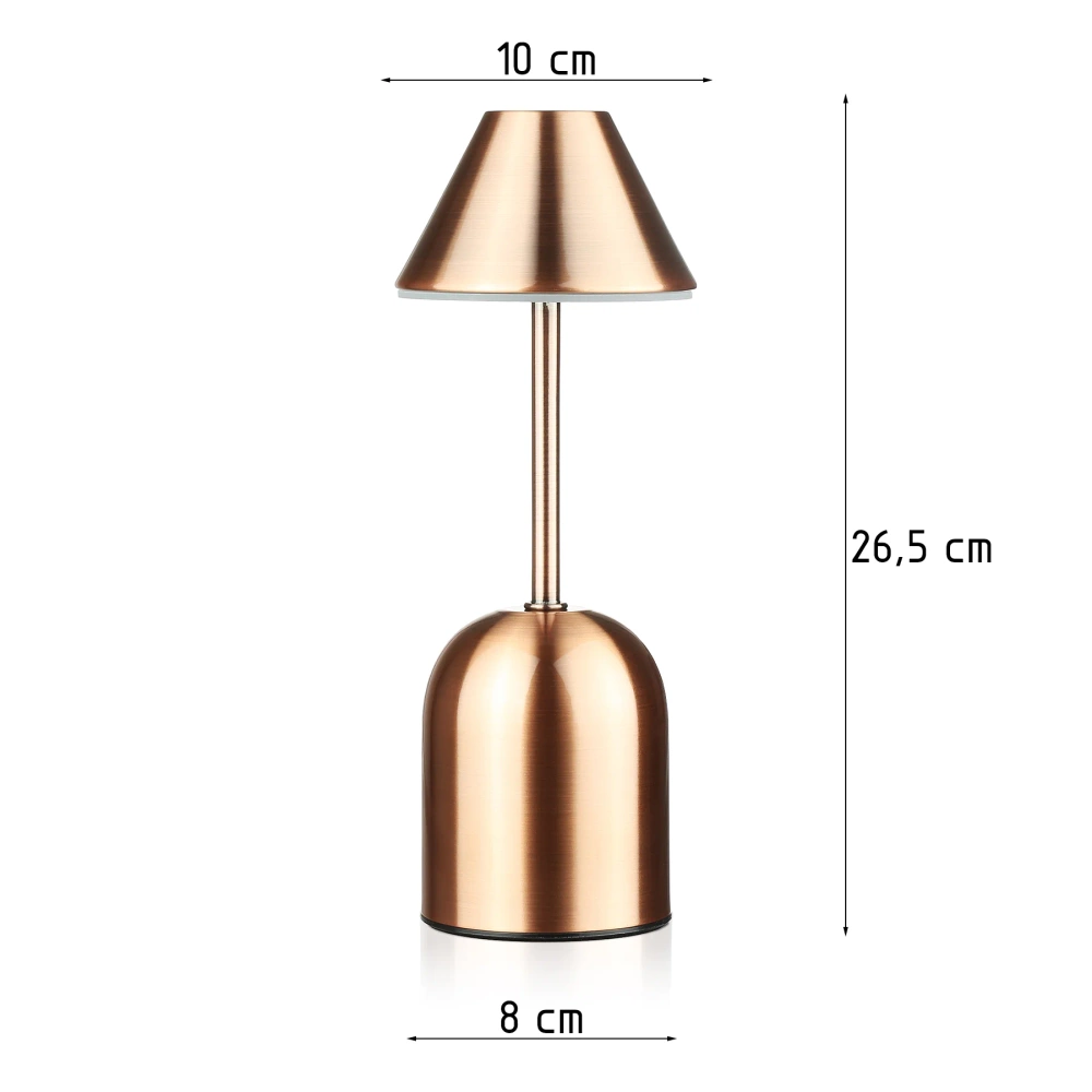 - - Edles kupferfarbenes Metallgehäuse. - Berührungsempfindliche Einstellung von Lichtfarbe und Helligkeit. - 2000 mAh Akku – funktioniert kabellos. - Multifunktional – für Haus, Garten, Gastronomie und Hotel.