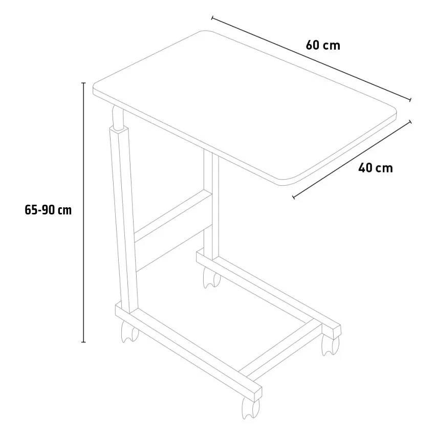 - -Einstellbare Höhe (65–90 cm). -Mobilität: 4 Schwenkräder (2 mit Feststellmechanismus) ermöglichen ein einfaches Bewegen. - Einschubdesign: Lässt sich leicht unter die Couch oder das Bett schieben. -Kompakte Abmessungen (60×40 cm): ideal für kleine Räume.