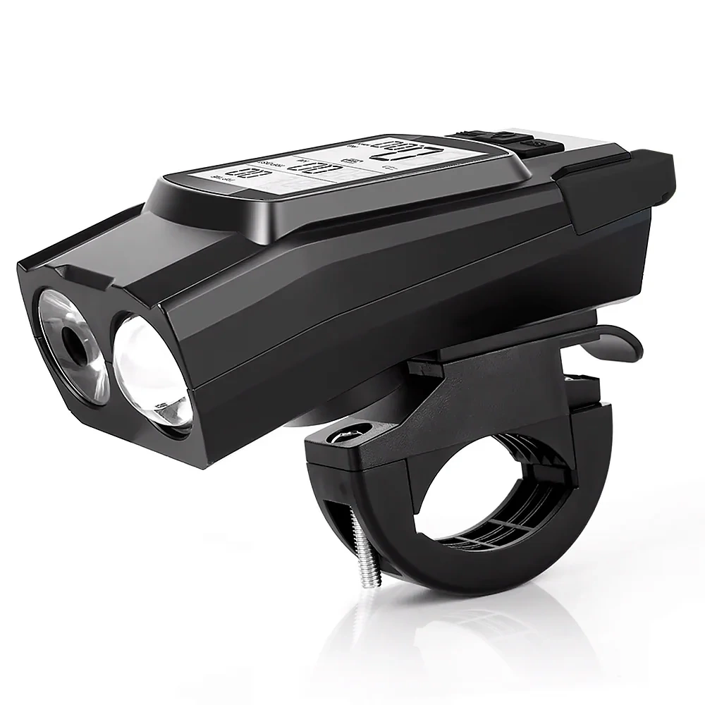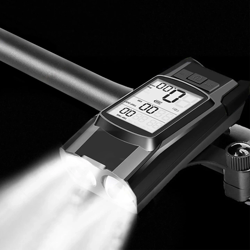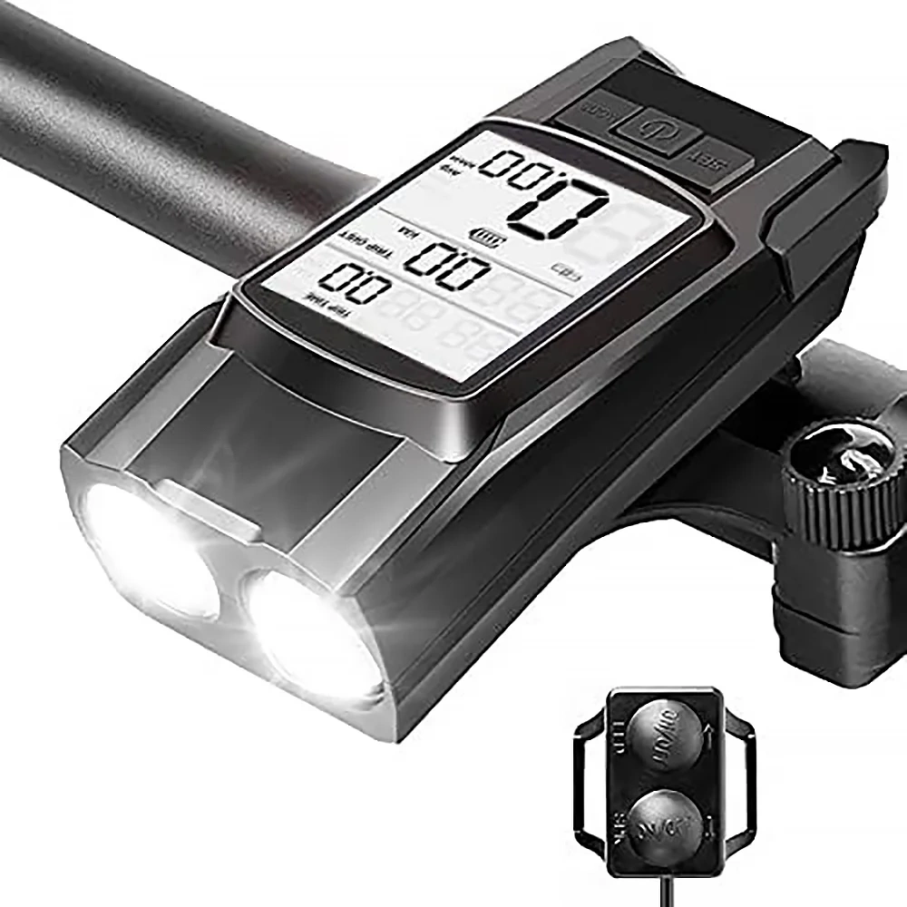 - -3in1: LED-Frontlicht, Fahrradcomputer und Hupe in einem Gerät. - Leistungsstarkes Licht 800 lm: vier Beleuchtungsmodi, Reichweite bis zu 200 Meter. - Kabelloser Zähler: misst Geschwindigkeit, Distanz, Zeit, verbrannte Kalorien.
