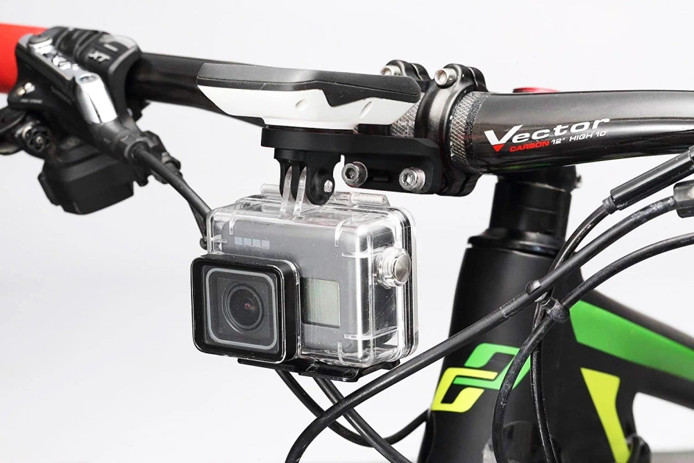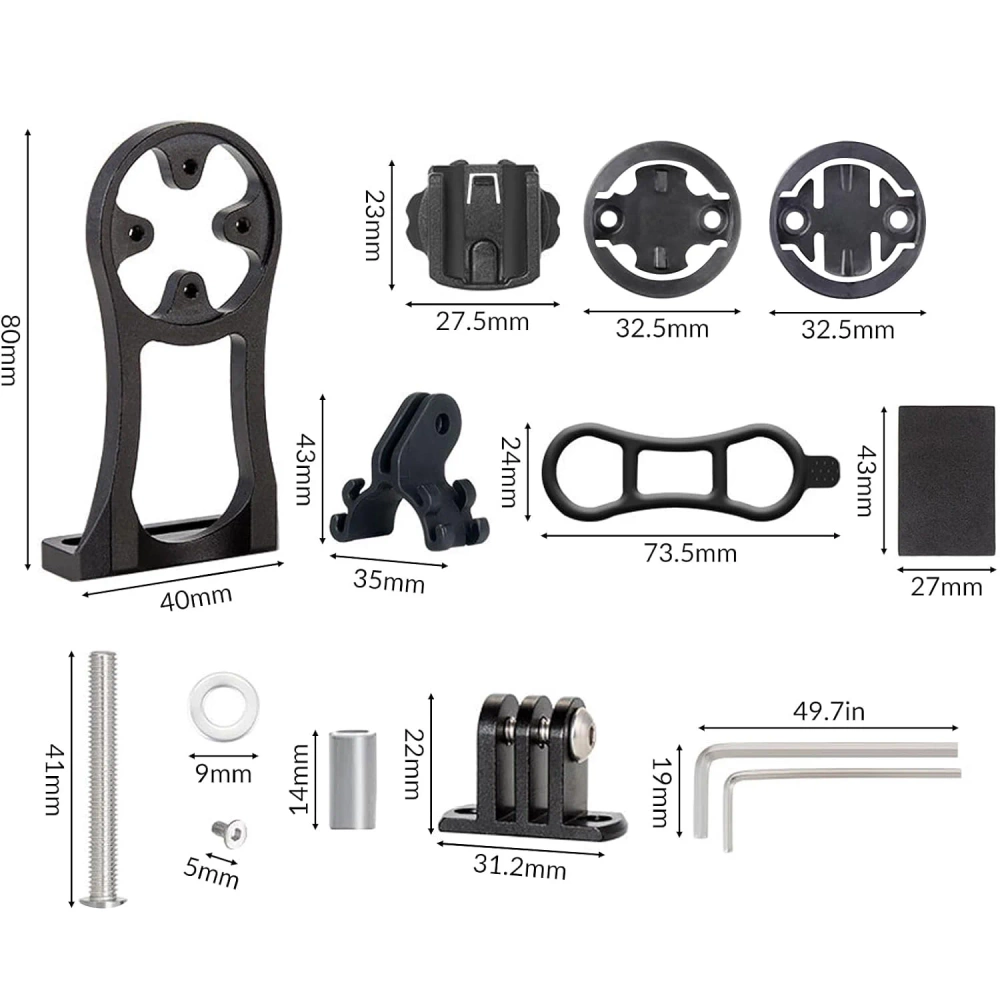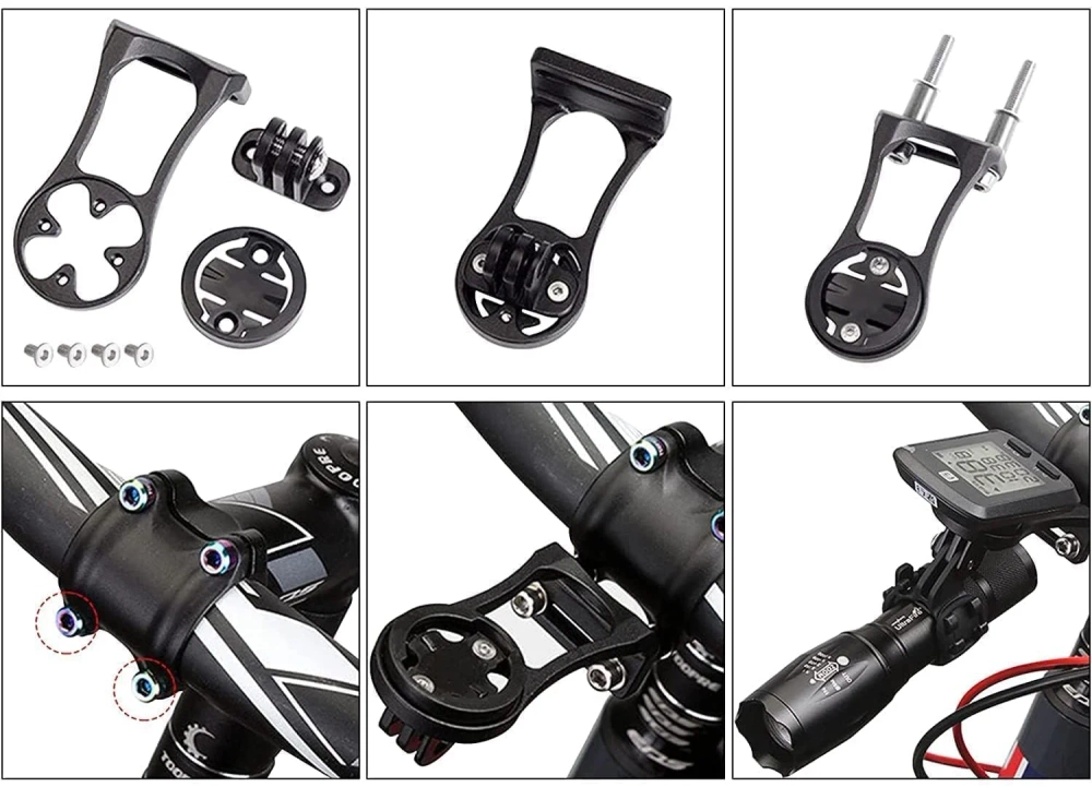 - Lieferumfang: 1 x Aluminiumhalterung, 1 x Adapter für Garmin, 1 x Adapter für Bryton, 1 x Adapter für Cateye, 1 x GoPro-Halterung, 1 x Lichthalterung, 1 x Gummischelle, 1 x selbstklebende Dichtung, 2 x Distanzstücke, 2 x lange M5-Schrauben, 2 x Metallunterlegscheiben, 6 x Schrauben für Adapterbefestigung, 3 x Inbusschlüssel, 1 x GoPro-Schraube