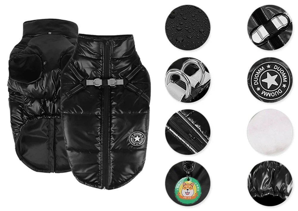 Remekül ötvözi a stílust, a biztonságot és a funkcionalitást. Megóvja a kutyát a hidegtől és esőtől, kényelmet ad a séták során, és feleslegessé teszi a külön hám használatát.